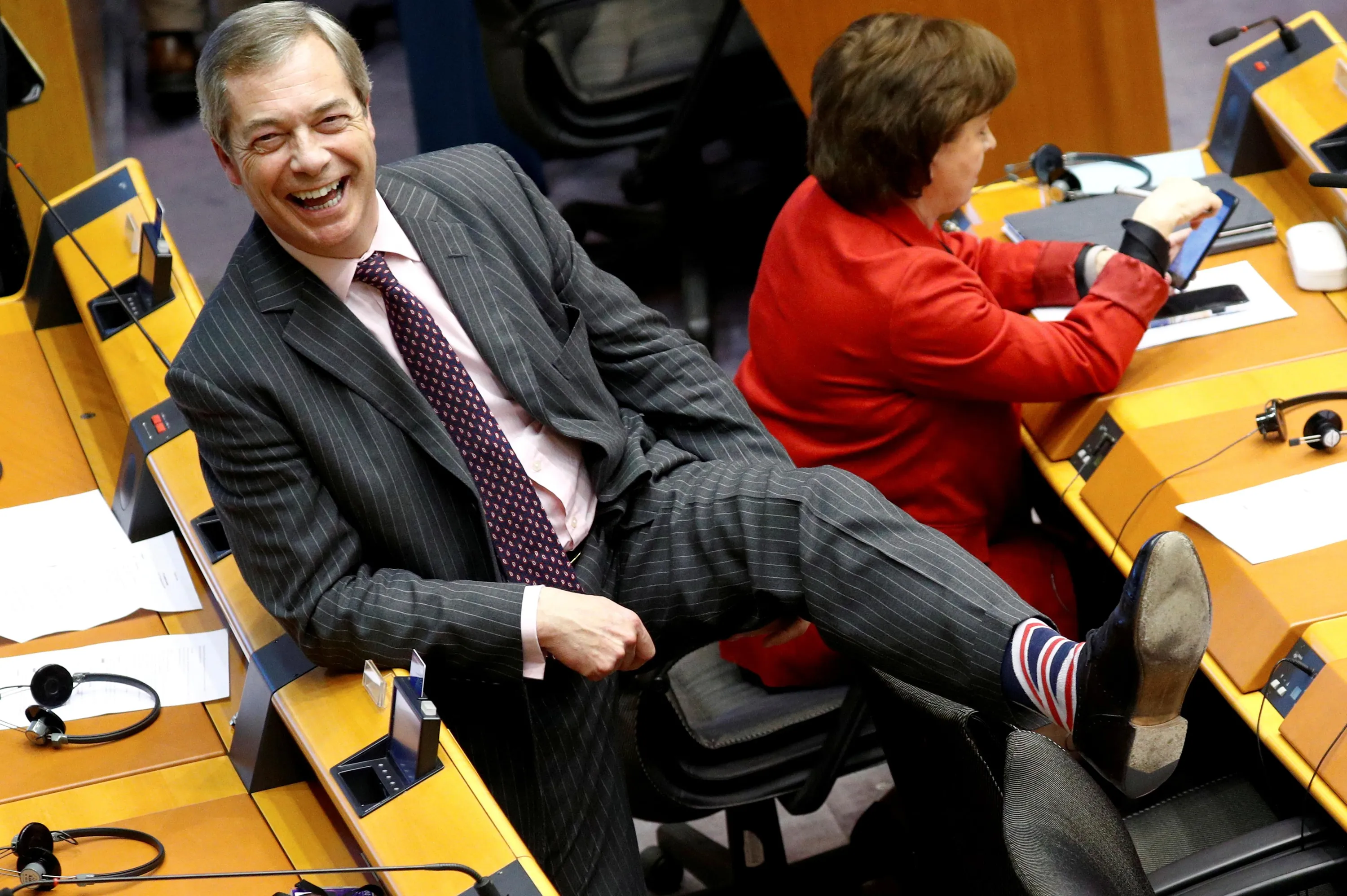 Brexit Party leader Nigel Farage smiles as he shows his socks during a plenary session at the European Parliament in Brussels, Belgium on January 29, 2020. The European Parliament gave final approval to Britain's divorce from the European Union, paving the way for the country to quit the bloc on Friday after nearly half a century and delivering a major setback for European integration. (Photo by Francois Lenoir/Reuters)