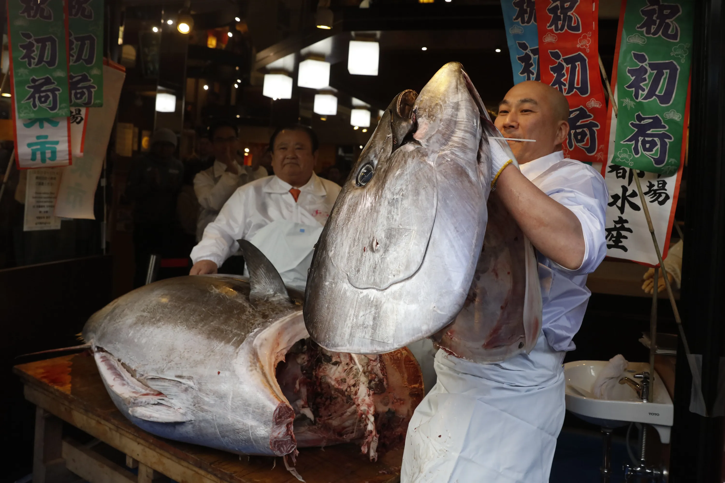 A sushi chef holds up the head of a bluefin tuna at a restaurant in Tsukji market area in Tokyo, Sunday, January 5, 2020, after it was sold at the first auction of 2020 at Tokyo's Toyosu fish market. The tuna was sold 193.2 million yen (1.8 million US dollars) Sunday. (Photo by Jae C. Hong/AP Photo)