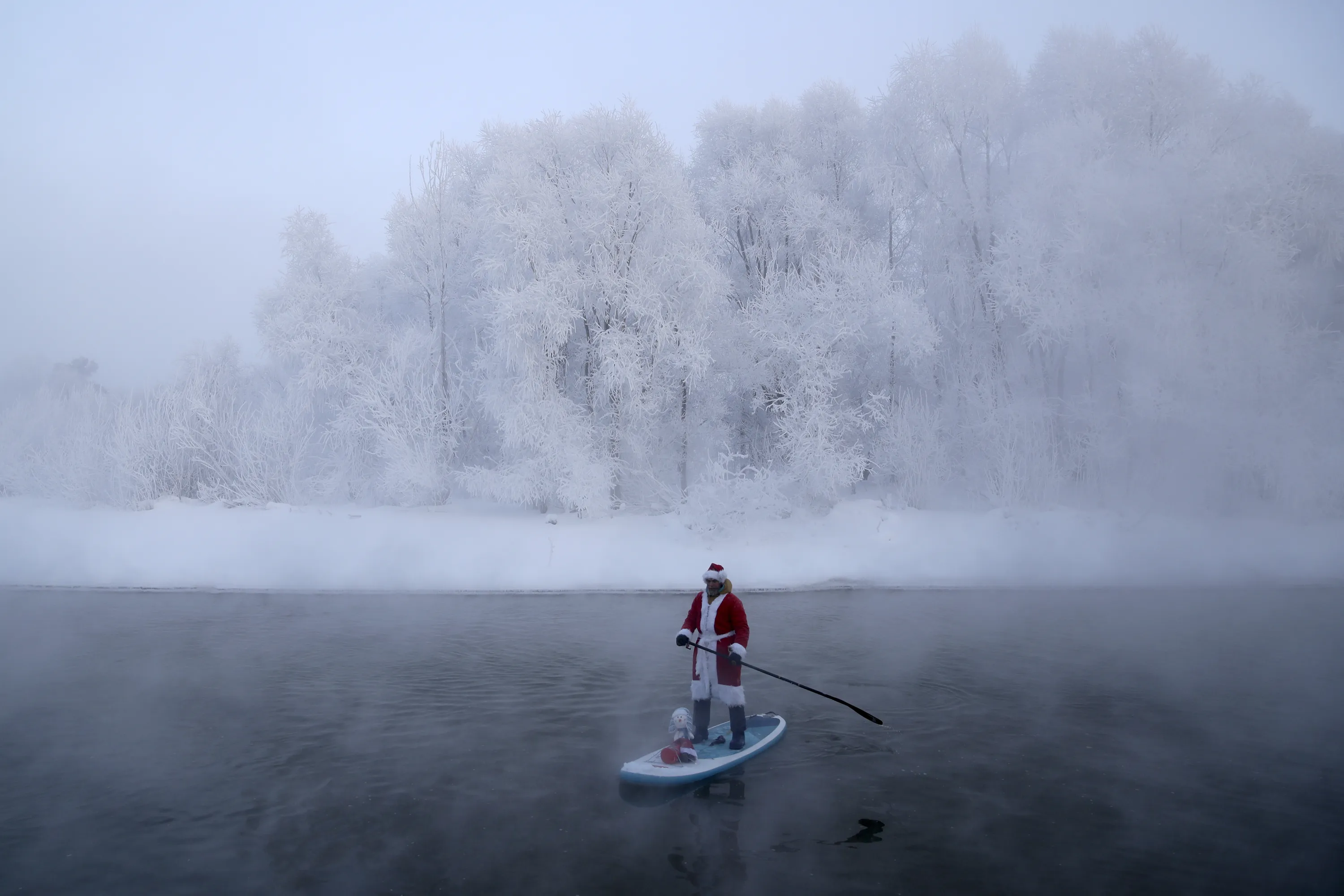 SUP_Novosibirsk stand up paddle boarding club founder Yevgeny Popov in a Santa Claus costume SUP surfs on a confluent of the Ob River in Novosibirsk, Russia on December 27, 2020. (Photo by Kirill Kukhmar/TASS)