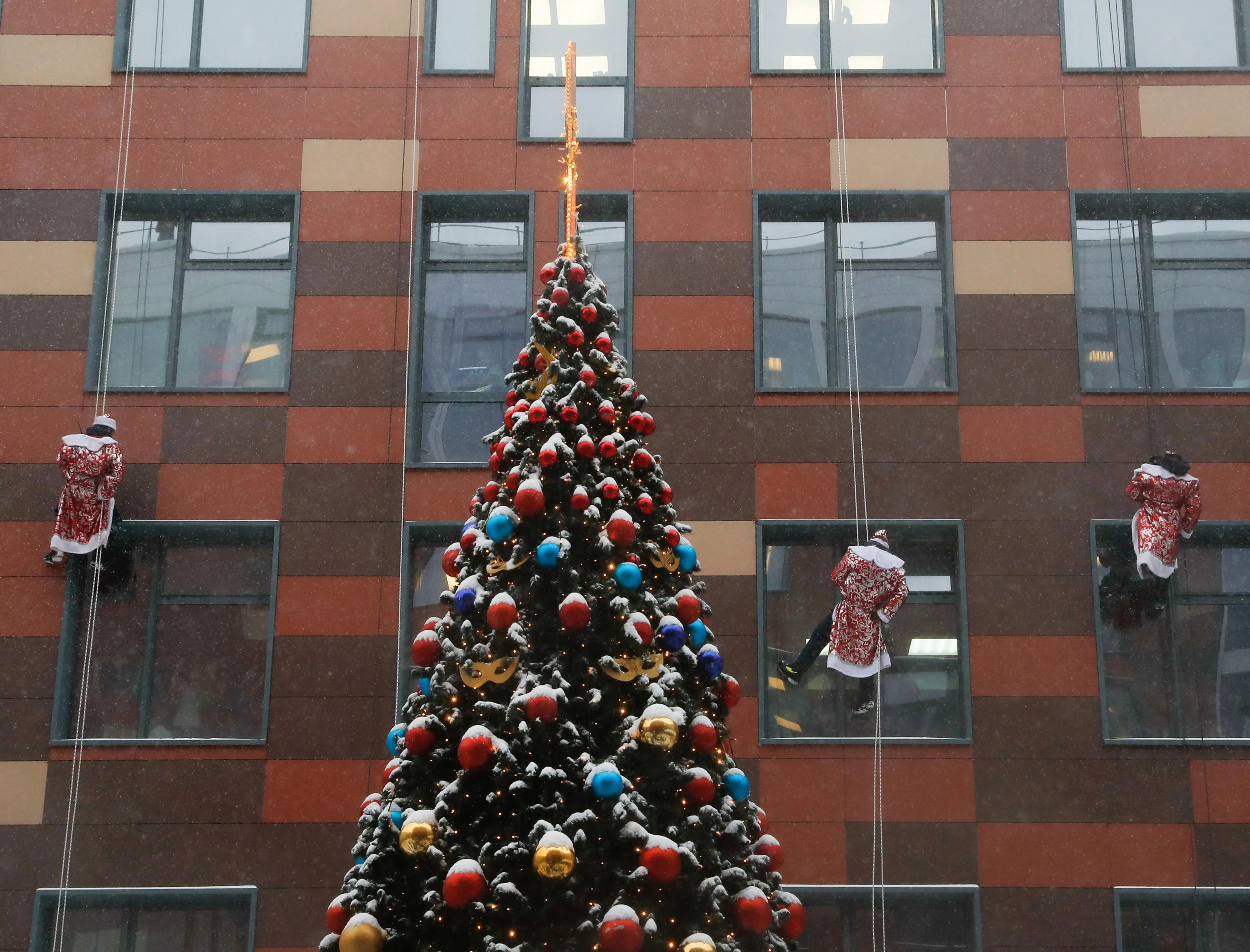 Members of rescue services dressed as Father Frost rappel down the facade of the hospital to congratulate child patients on the upcoming New year, in Moscow, Russia on December 25, 2020. (Photo by Evgenia Novozhenina/Reuters)