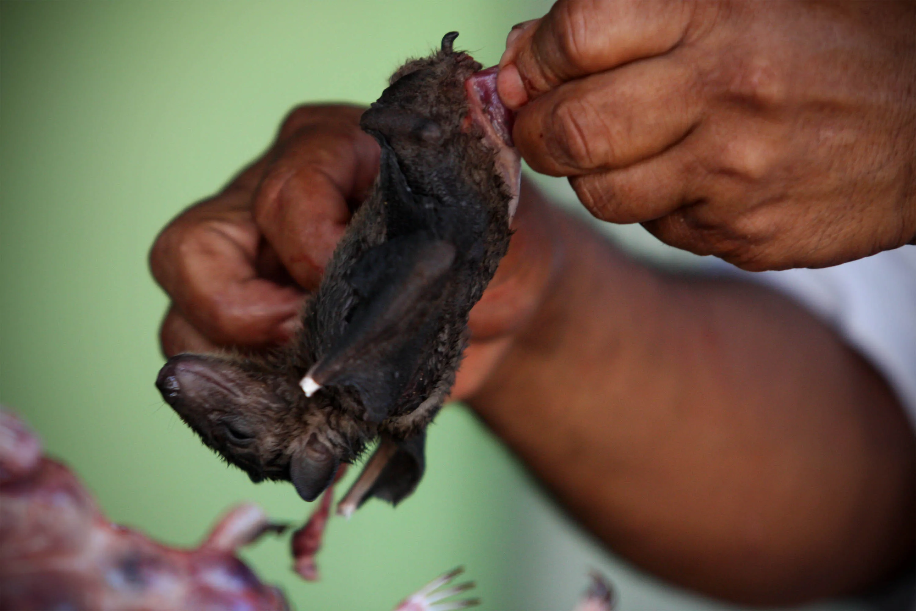 YOGYAKARTA, INDONESIA - JULY 30: A bat seller skins a bat on July 30, 2009 in Yogyakarta, Indonesia. Sukarwati and her family have hunted bats in the Imogiri region for generations, capturing more than 800 bats per month. The Sukarwati family believe that the meat from the bat heals asthma and respiratory problems and it is a great honour for them knowing that the meat that they provide will help ease people?s health ailments. (Photo by Ulet Ifansasti/Getty Images)