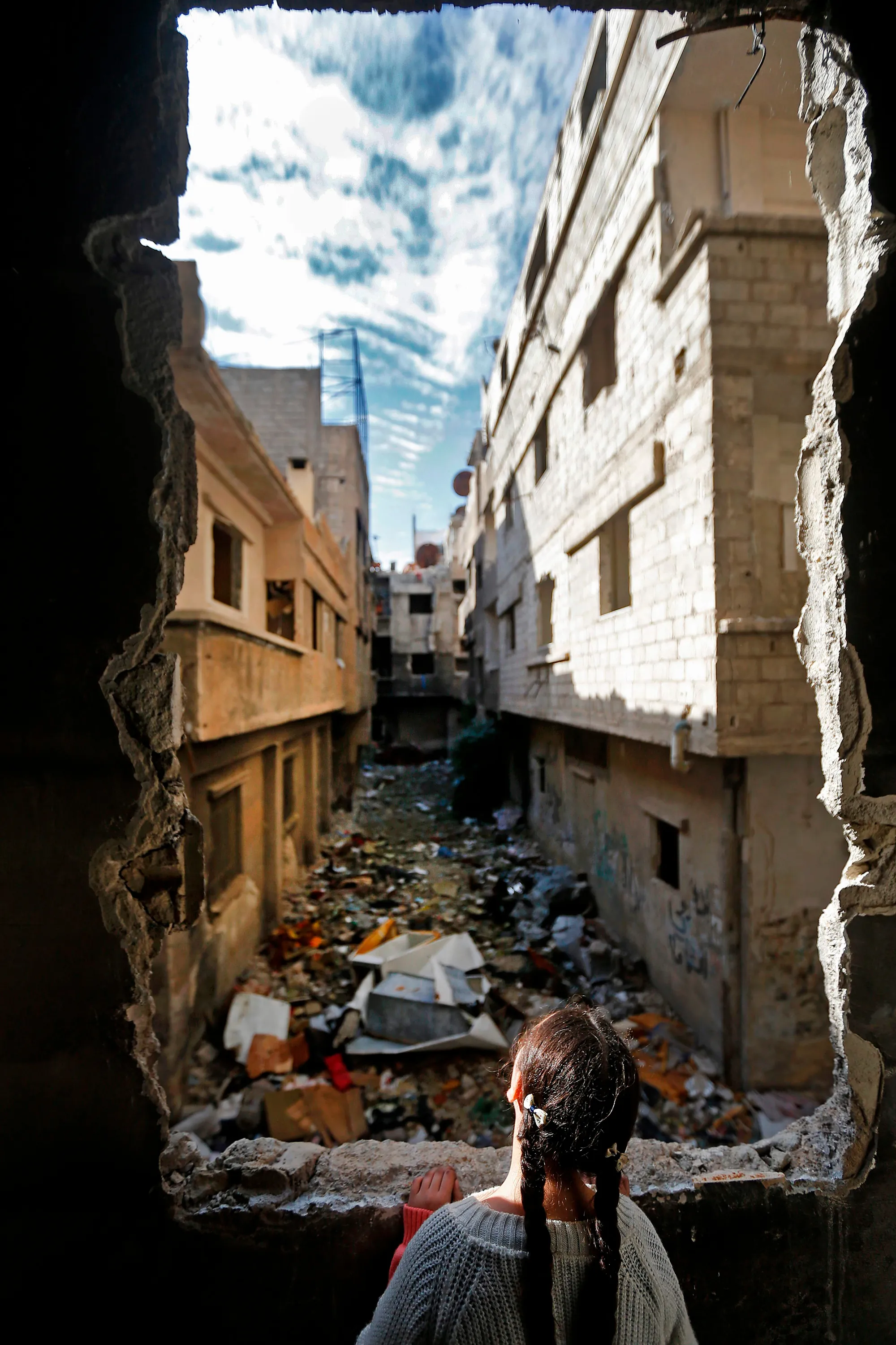Shatha, the daughter of 48-year-old Palestinian refugee Issa al-Loubani, looks out the window of their apartment in the Palestinian Yarmuk camp on the southern outskirts of Damascus, Syria on November 25, 2020. (Photo by Louai Beshara/AFP Photo)