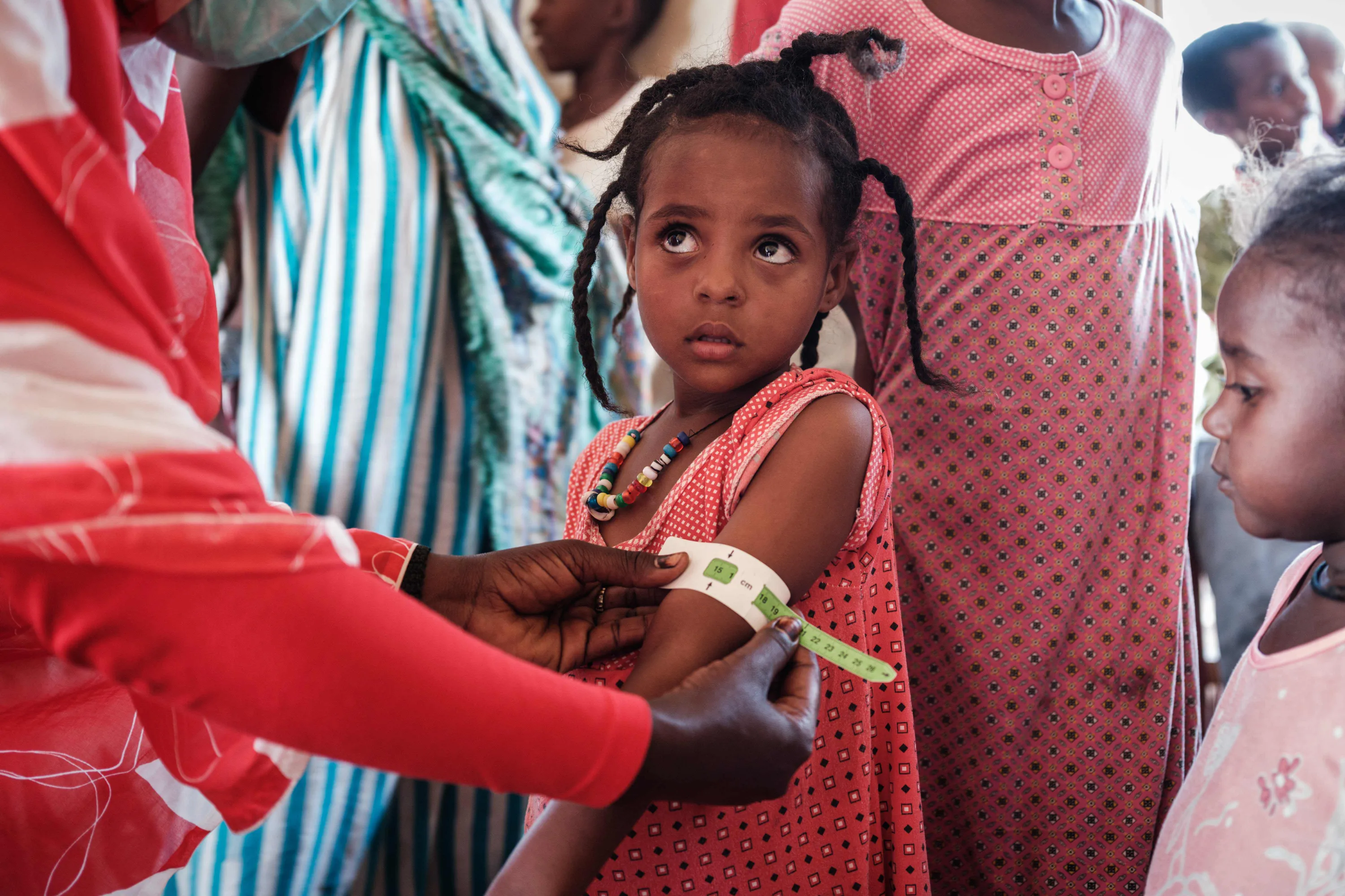 A four-year-old Ethiopian girl who fled the Tigray conflict as a refugee is measured at a malnutrition center at Village Eight transit centre near the Ethiopian border in Gedaref, eastern Sudan, on December 2, 2020. (Photo by Yasuyoshi Chiba/AFP Photo)