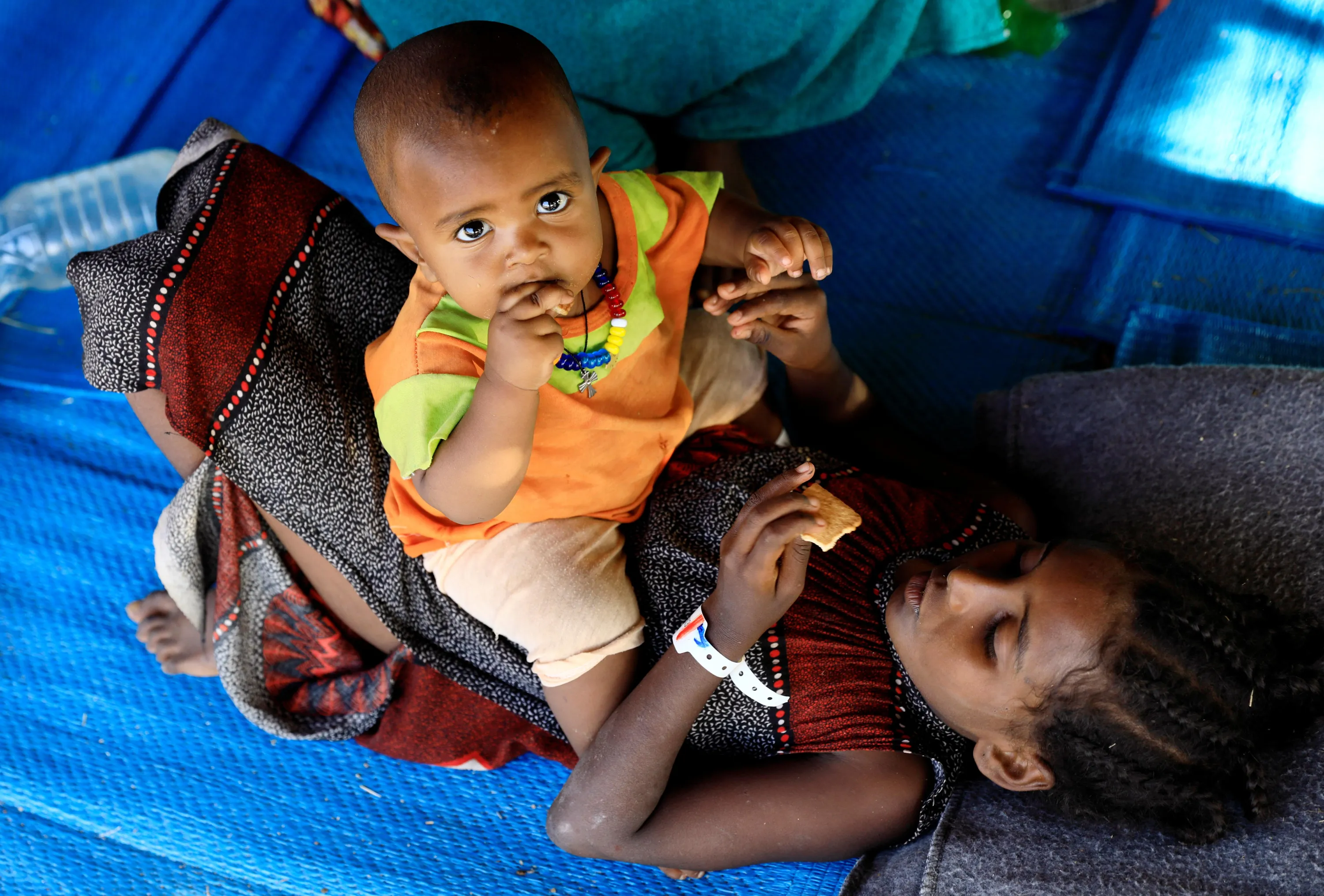An Ethiopian woman who fled war in Tigray region, is seen with her child inside a makeshift shelter at the Um-Rakoba camp on the Sudan-Ethiopia border in Al-Qadarif state, Sudan on November 19, 2020. (Photo by Mohamed Nureldin Abdallah/Reuters)