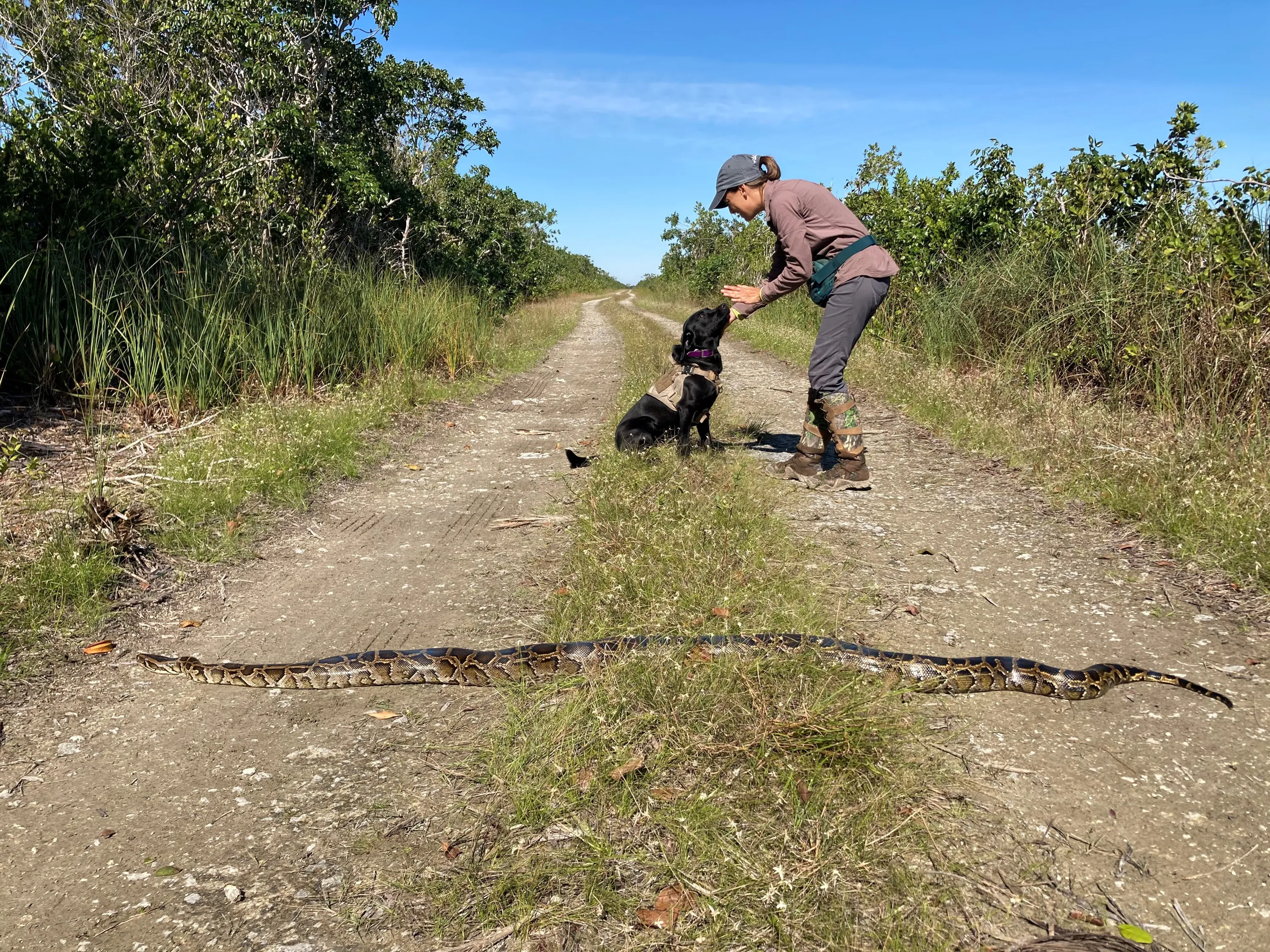 Dog-handler Paula Ziadi instructs Truman after he tracked down an 8ft python in Miami-Dade County, Florida, USA. The Florida Fish and Wildlife Conservation Commission is beginning a new programme to use dogs to sniff out invasive pythons. (Photo by Florida Fish and Wildlife Conservation Commission/AP Photo)