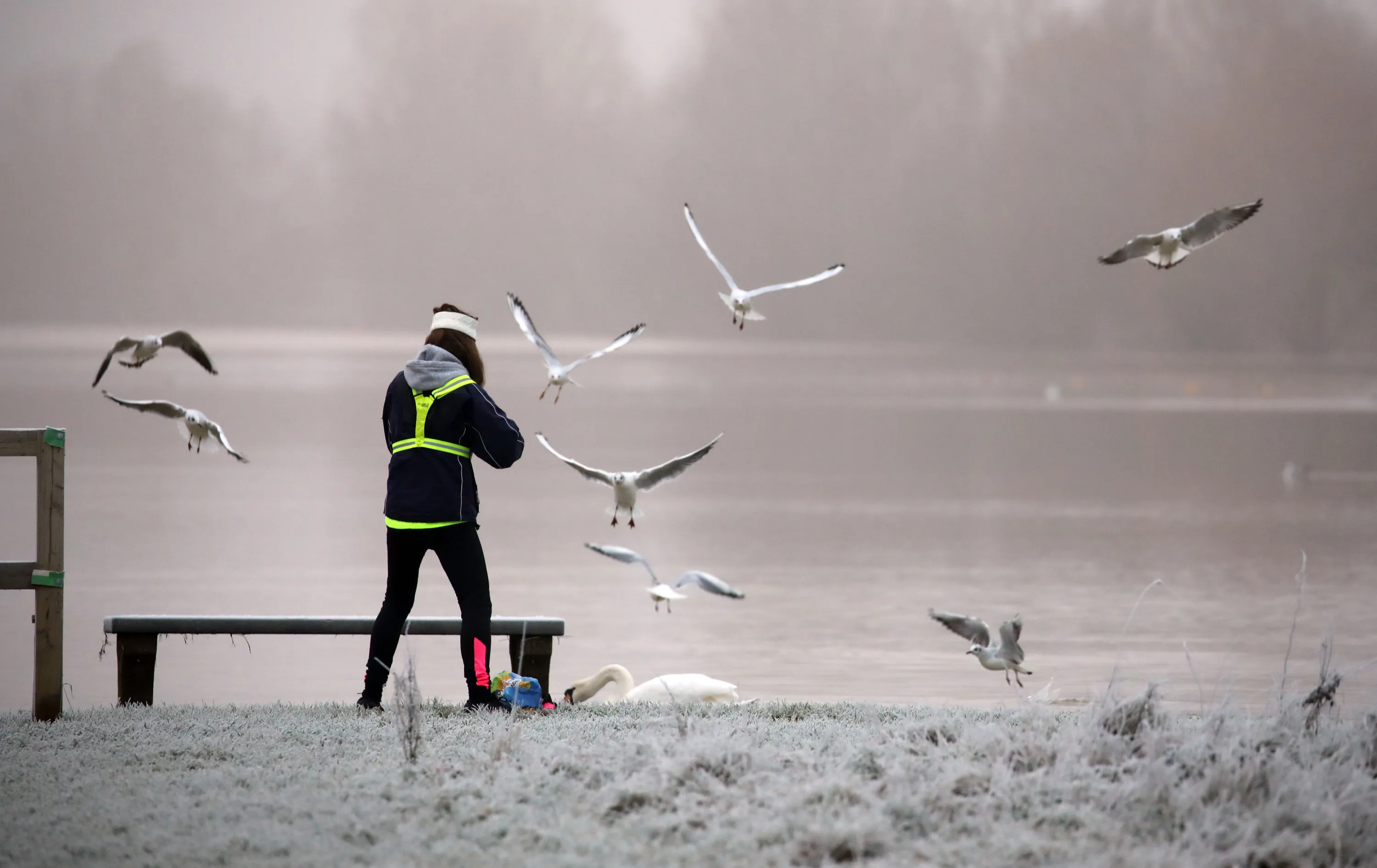 A lady tries to feed a swan but seagulls invade the scene on a frosty start to the day at Nene Park in Peterborough, Cambridgeshire, United Kingdom on December 31, 2020. (Photo by Paul Marriott/Rex Features/Shutterstock)