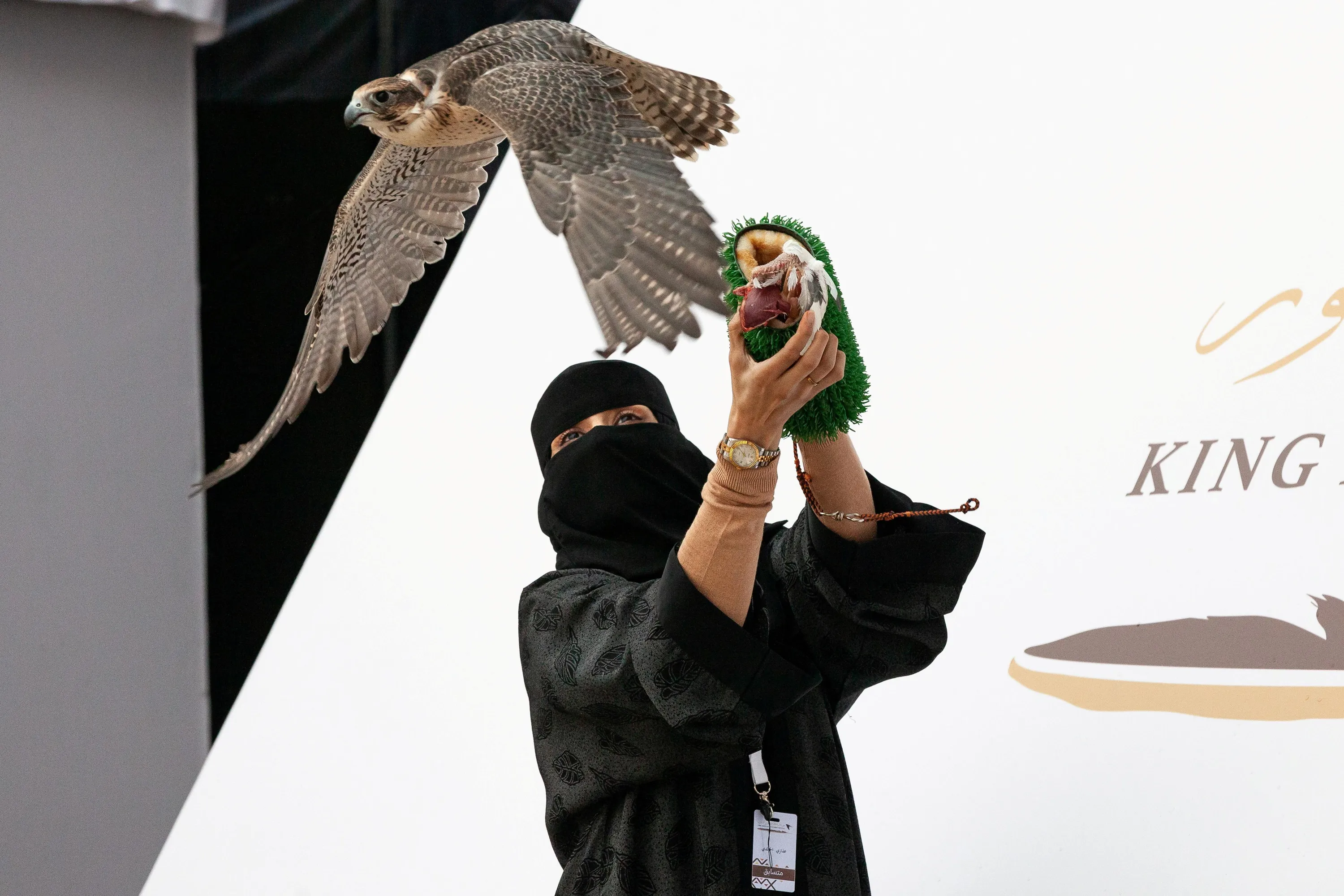 Athari Alkhaldi, the first Saudi woman to qualify and participate in the King Abdulaziz Falconry Festival, holds a falcon during the show in Riyadh, Saudi Arabia on December 6, 2020. (Photo by King Abdulaziz Falconry Media Center via Reuters)