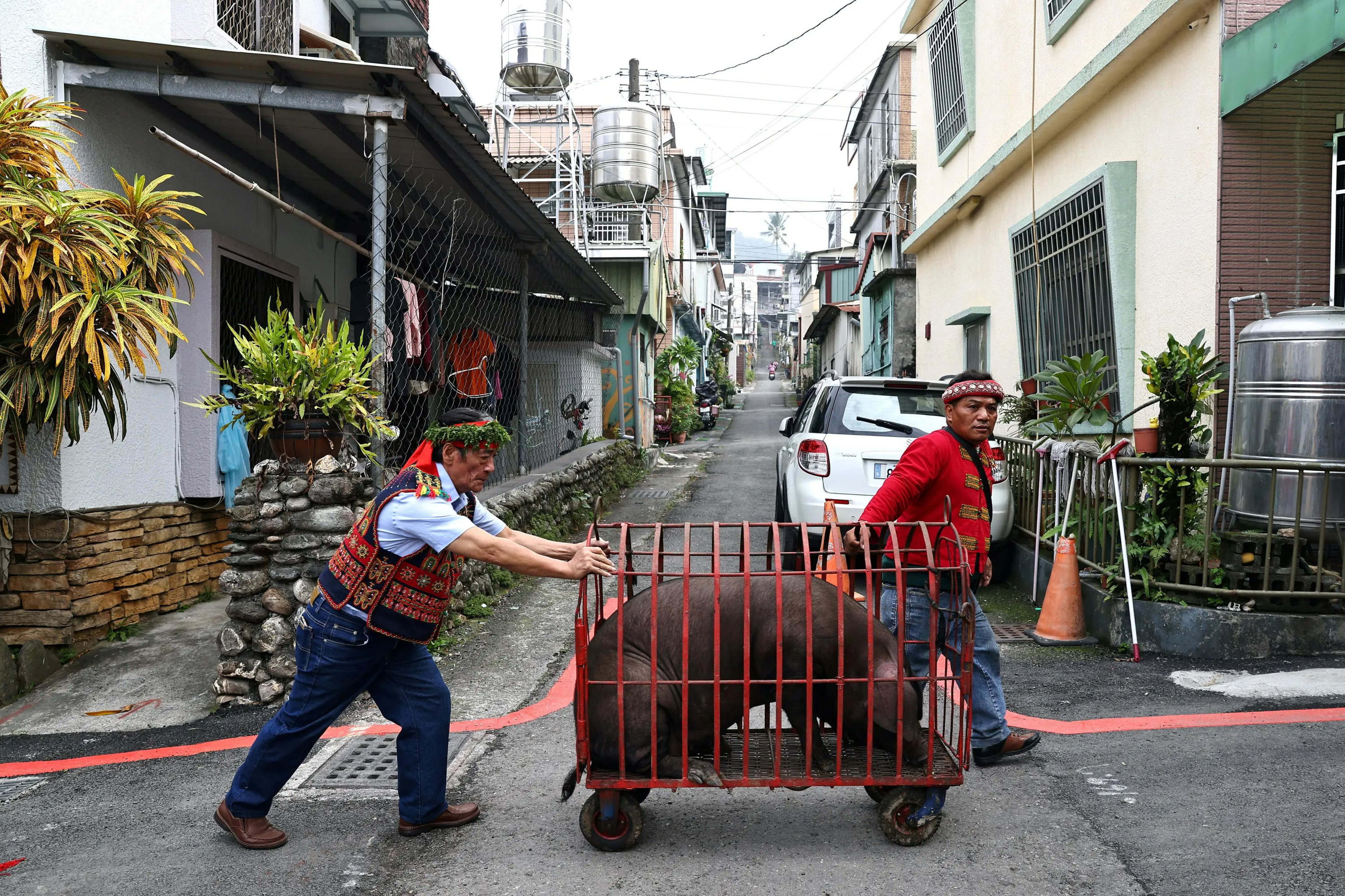 Men from the Paiwan tribe push a cart with a pig to the wedding ceremony in Pingtung, Taiwan, December 12, 2020. (Photo by Ann Wang/Reuters)
