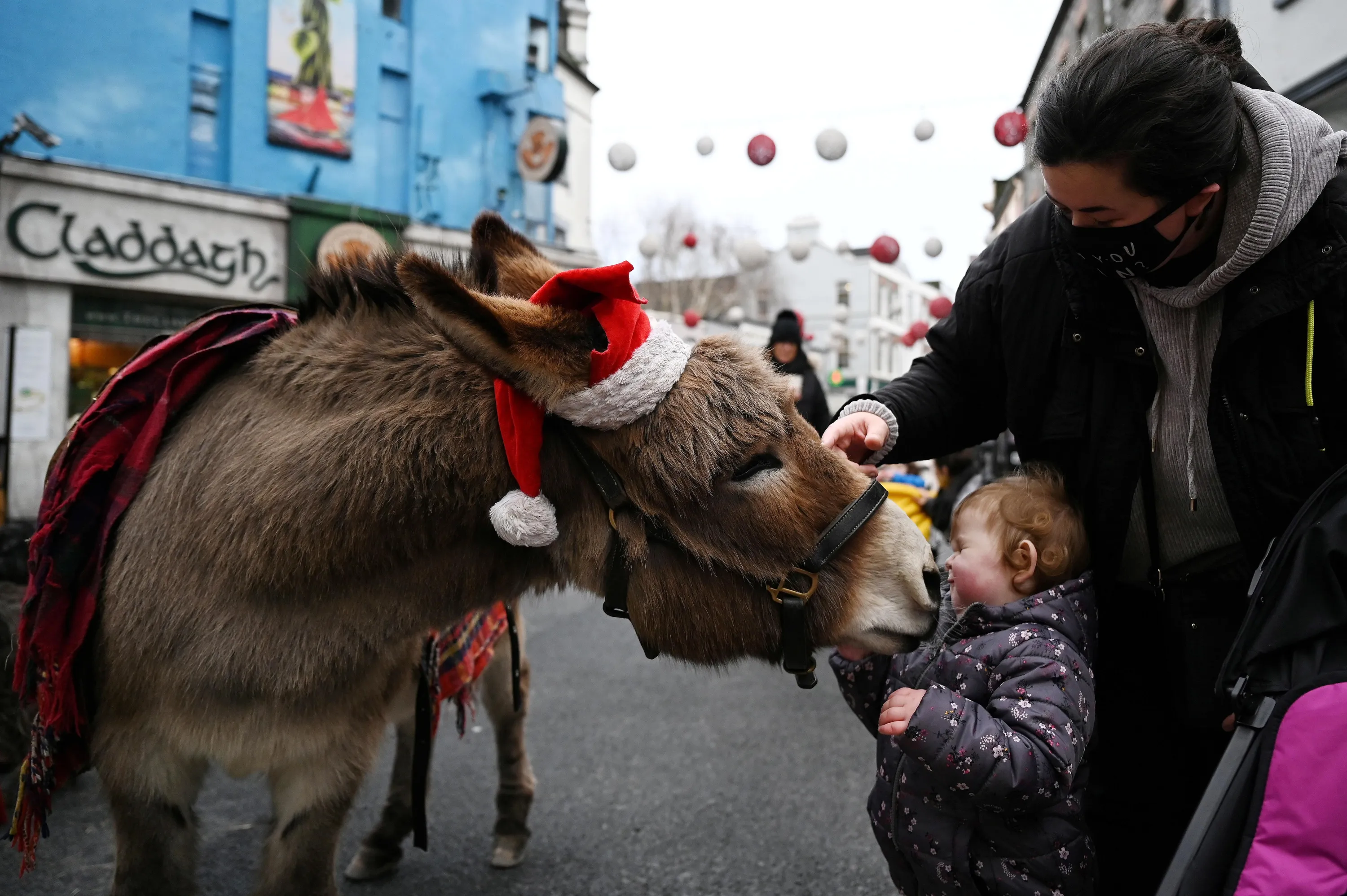 Two-year-old Sofia Fox is nuzzled by a donkey wearing a Santa hat in a shopping street in Galway, Ireland, December 22, 2020. (Photo by Clodagh Kilcoyne/Reuters)