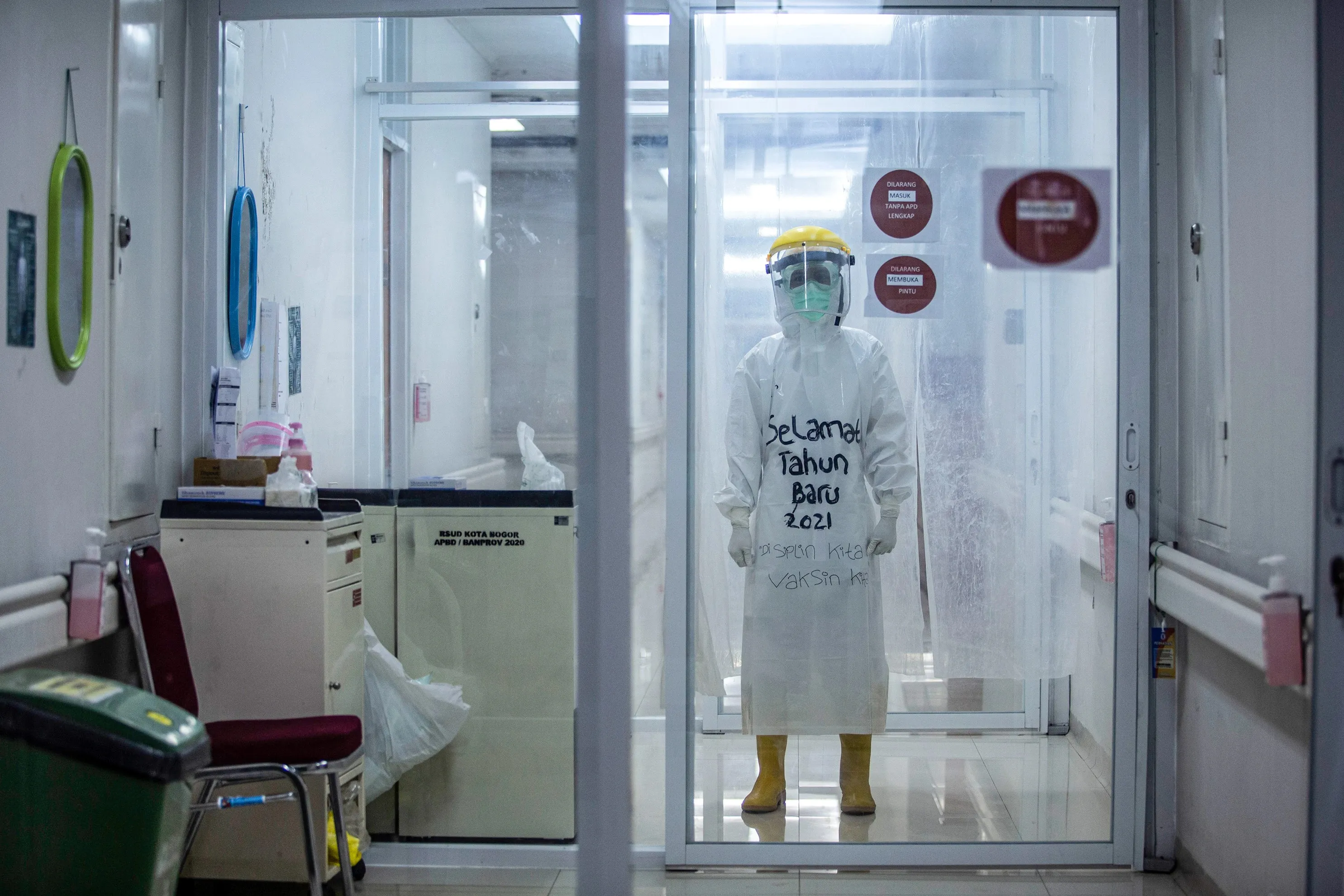 A medical staff wears personal protective equipment (PPE) with the words “Happy New Year 2021” to encourage COVID-19 coronavirus patients while working at the Bogor City Hospital in West Java on January 1, 2021. (Photo by Aditya Aji/AFP Photo)