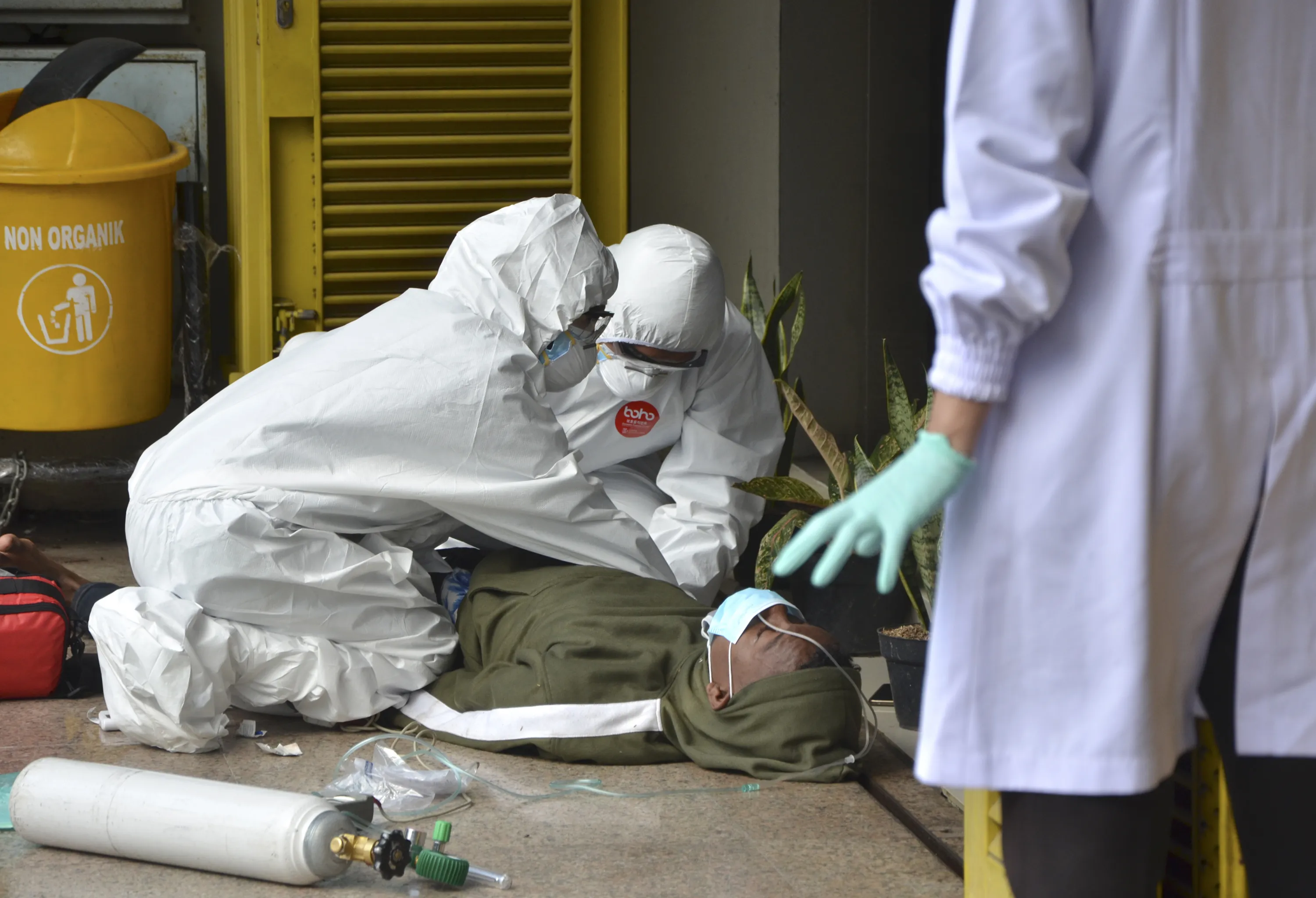Paramedics wearing protective suits amid fears of coronavirus outbreak check on a man who collapsed outside a clinic in Jakarta, Indonesia, Thursday, March 26, 2020. It's not immediately clear what caused the man to collapse. The U.S. Embassy in Indonesia has ordered the departure of employees' family members under the age of 21 from its missions in the country where new COVID-19 patients have surged in the past week with high fatality. (Photo by Muchlis Akbar/AP Photo)