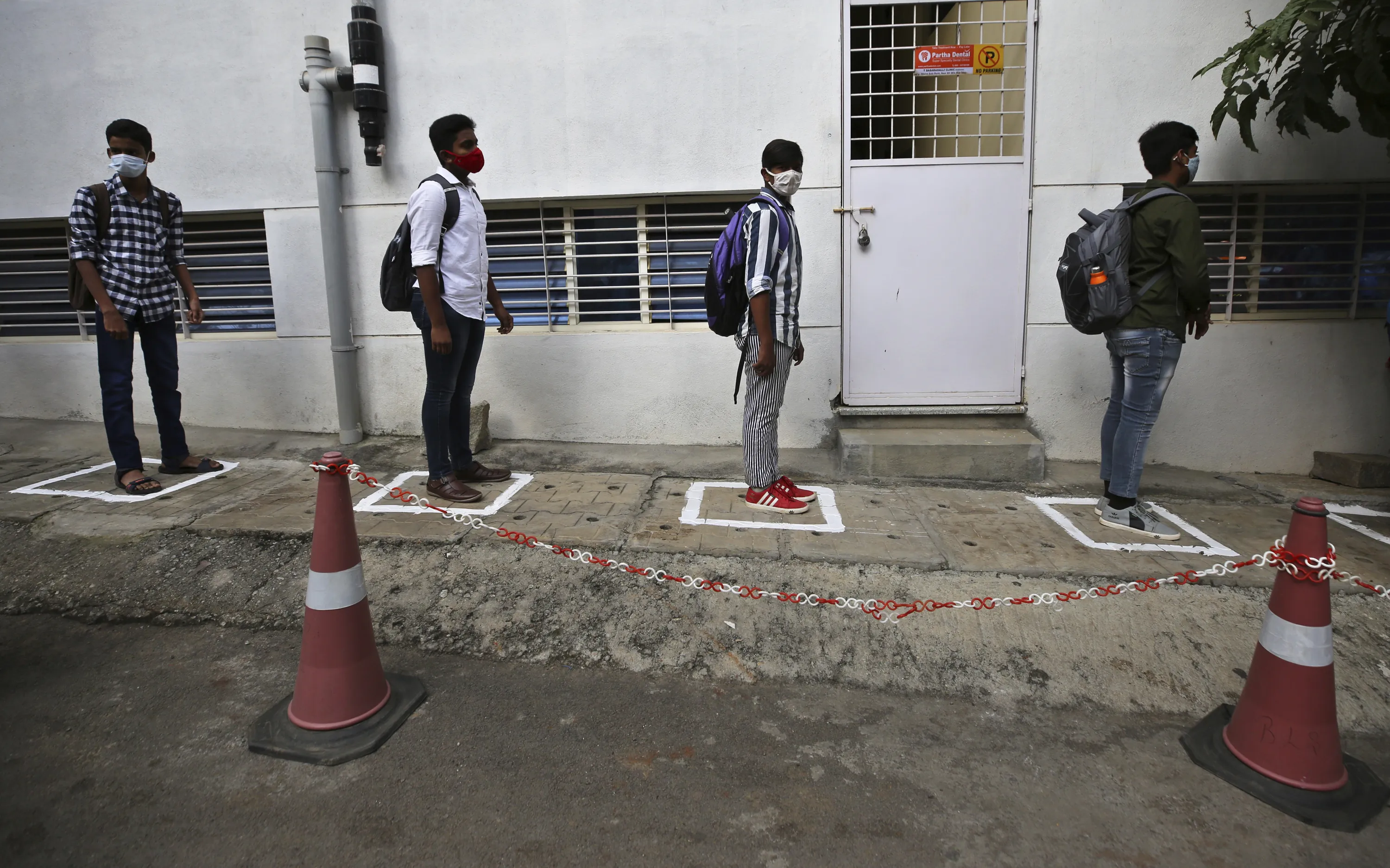 Students wearing face masks and maintain social distancing as a precaution against the coronavirus wait to enter the school in Bengaluru, India, Friday, January 1, 2021. The southern state of Karnataka on Friday opened schools for students of grade 10 and 12 after a gap of more than nine months. India has more than 10 million cases of coronavirus, second behind the United States. (Photo by Aijaz Rahi/AP Photo)