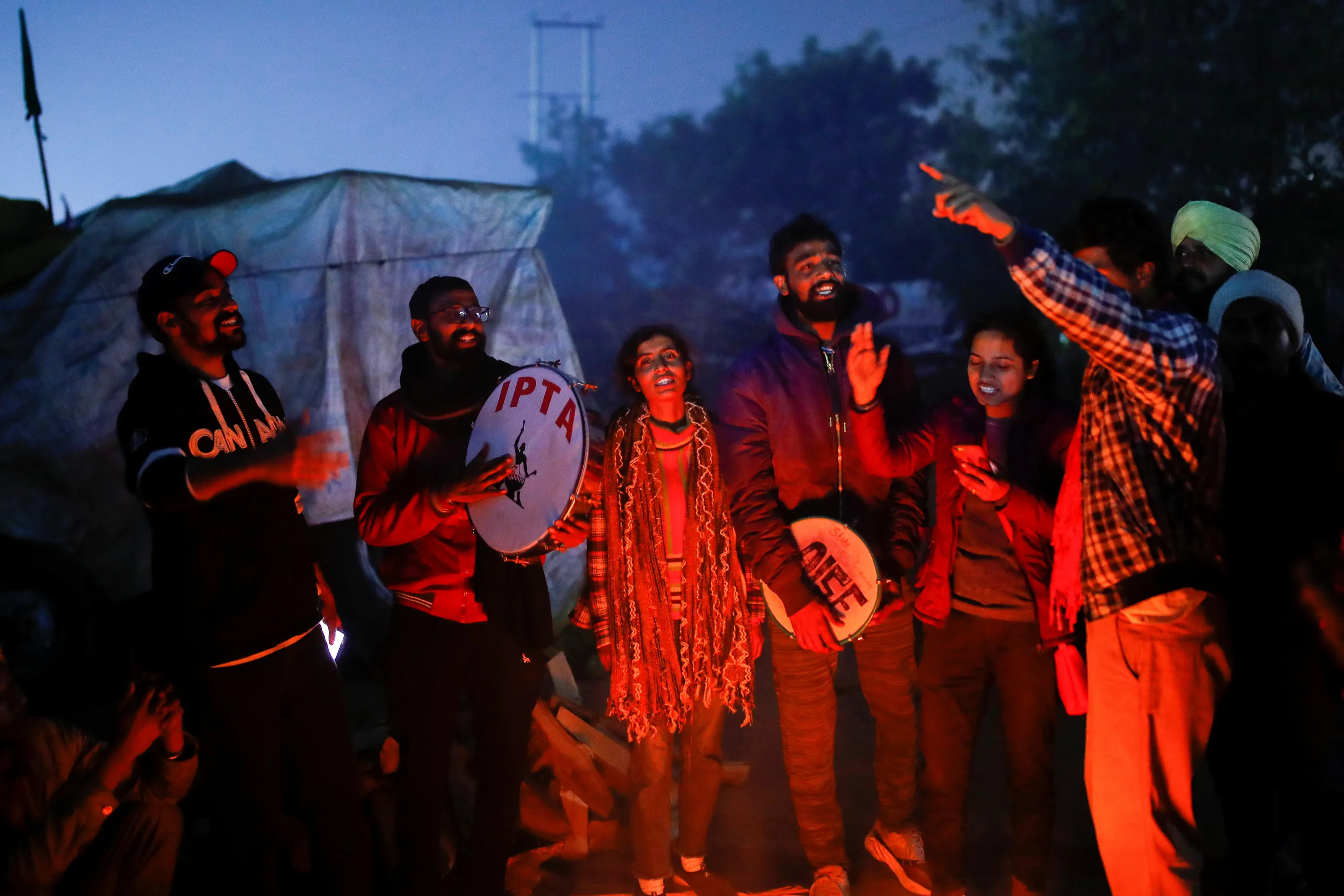 People sing as they gather to celebrate the arrival of the new year at the site of a protest against the newly passed farm bills at Singhu border near New Delhi, India, December 31, 2020. (Photo by Adnan Abidi/Reuters)