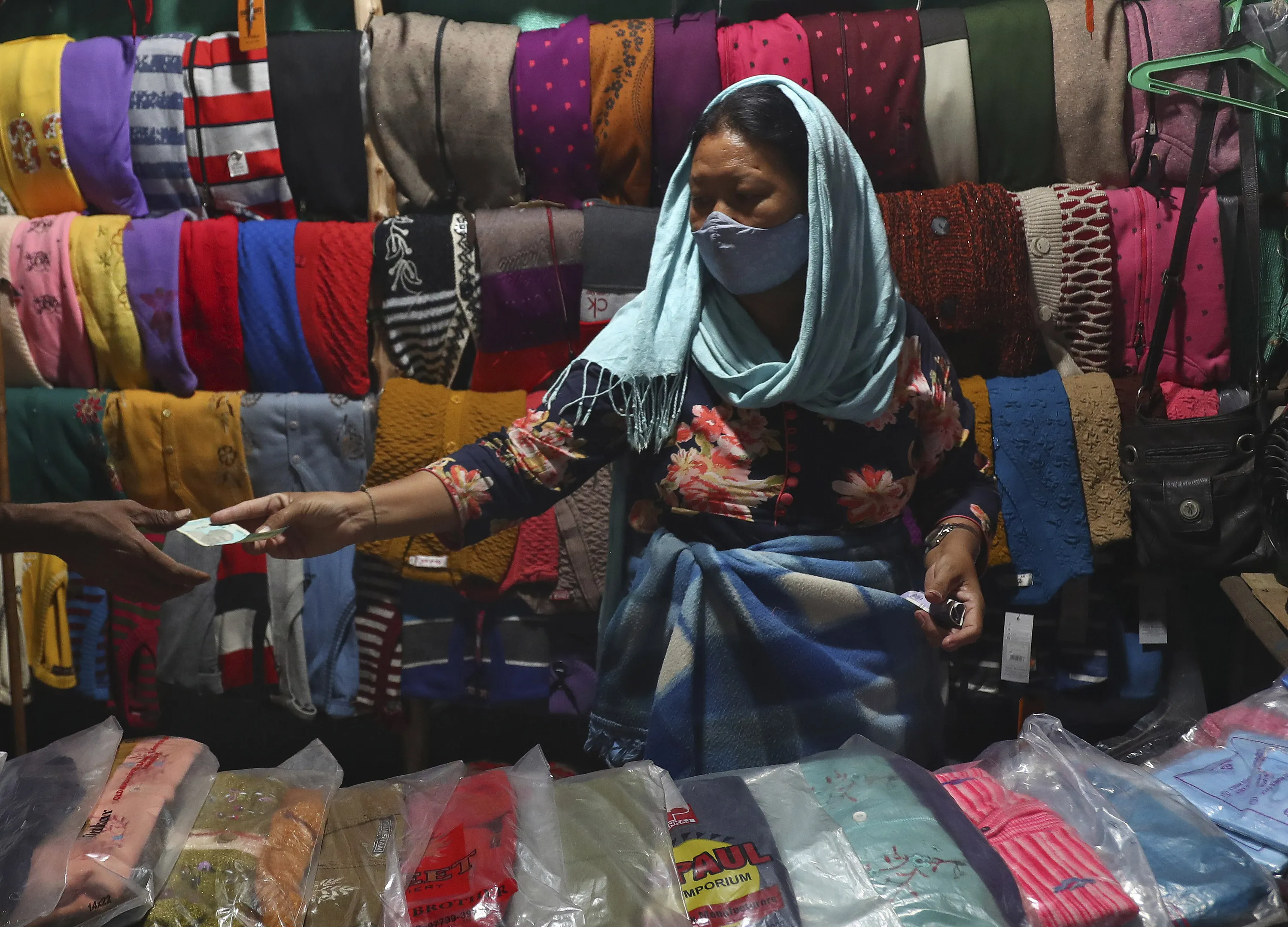 A Tibetan vendor wearing a face mask as a precaution against the coronavirus sells winter clothes on a street in Hyderabad, India, Tuesday, December 29, 2020. (Photo by Mahesh Kumar A./AP Photo)