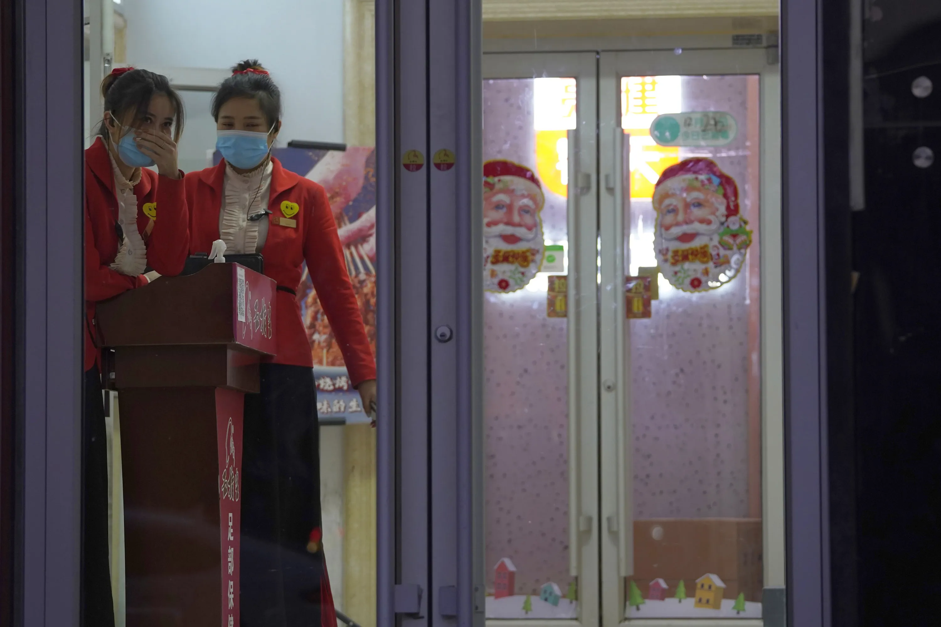 Chinese workers wait for customers at the entrance to a restaurant in Beijing on Sunday, December 27, 2020. China urges migrant workers not to travel home during February's Lunar New Year holiday to prevent further virus spread. (Photo by Ng Han Guan/AP Photo)