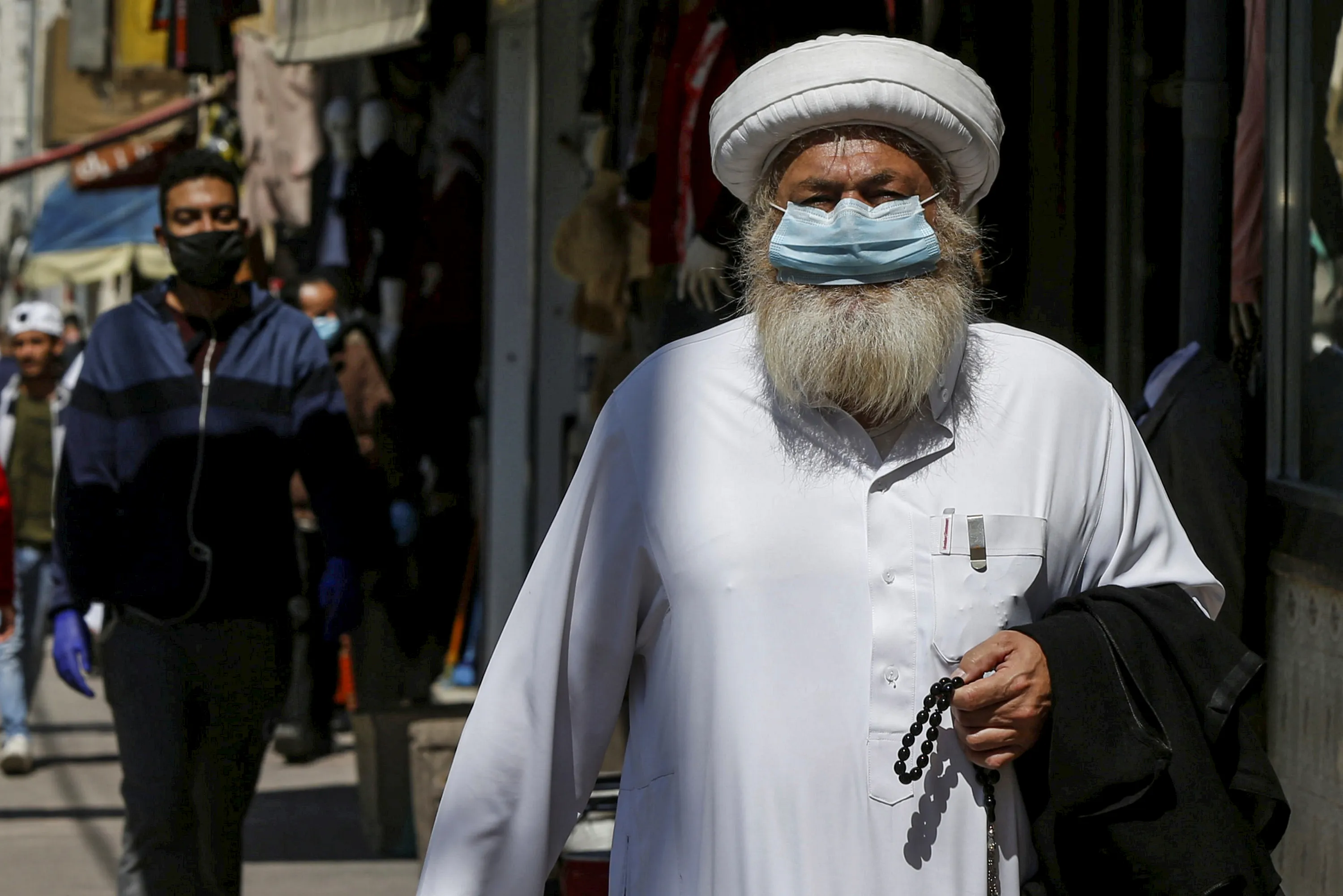 A man wears a protective face mask as he walks along the main market in downtown after the government eased the restrictions on movement aimed at containing the spread of the coronavirus disease (COVID-19), in Amman, Jordan on April 29, 2020. (Photo by Muhammad Hamed/Reuters)