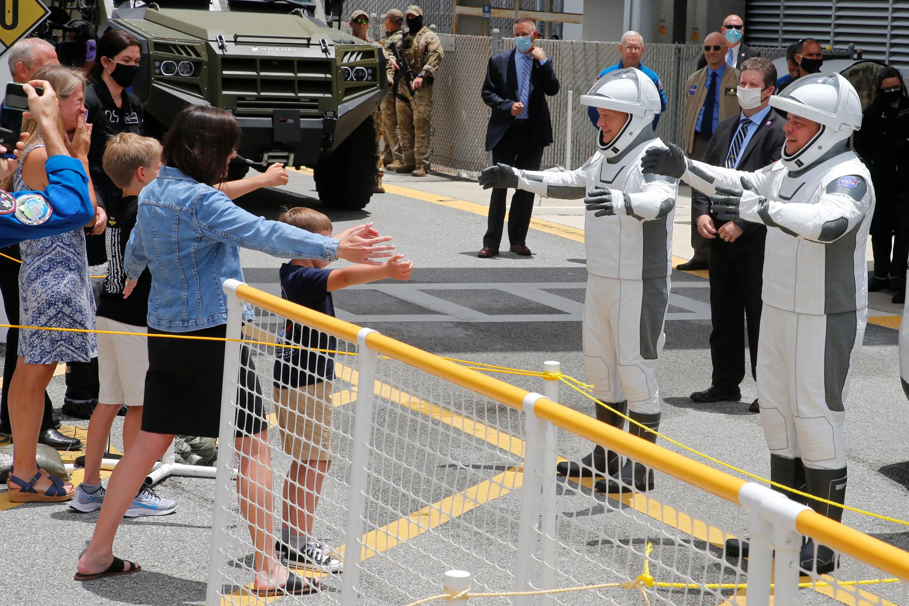 NASA astronauts Doug Hurley and Bob Behnken greet their families before the launch of a SpaceX Falcon 9 rocket and Crew Dragon spacecraft at the Kennedy Space Center, in Cape Canaveral, Florida, U.S., May 27, 2020. (Photo by Joe Skipper/Reuters)