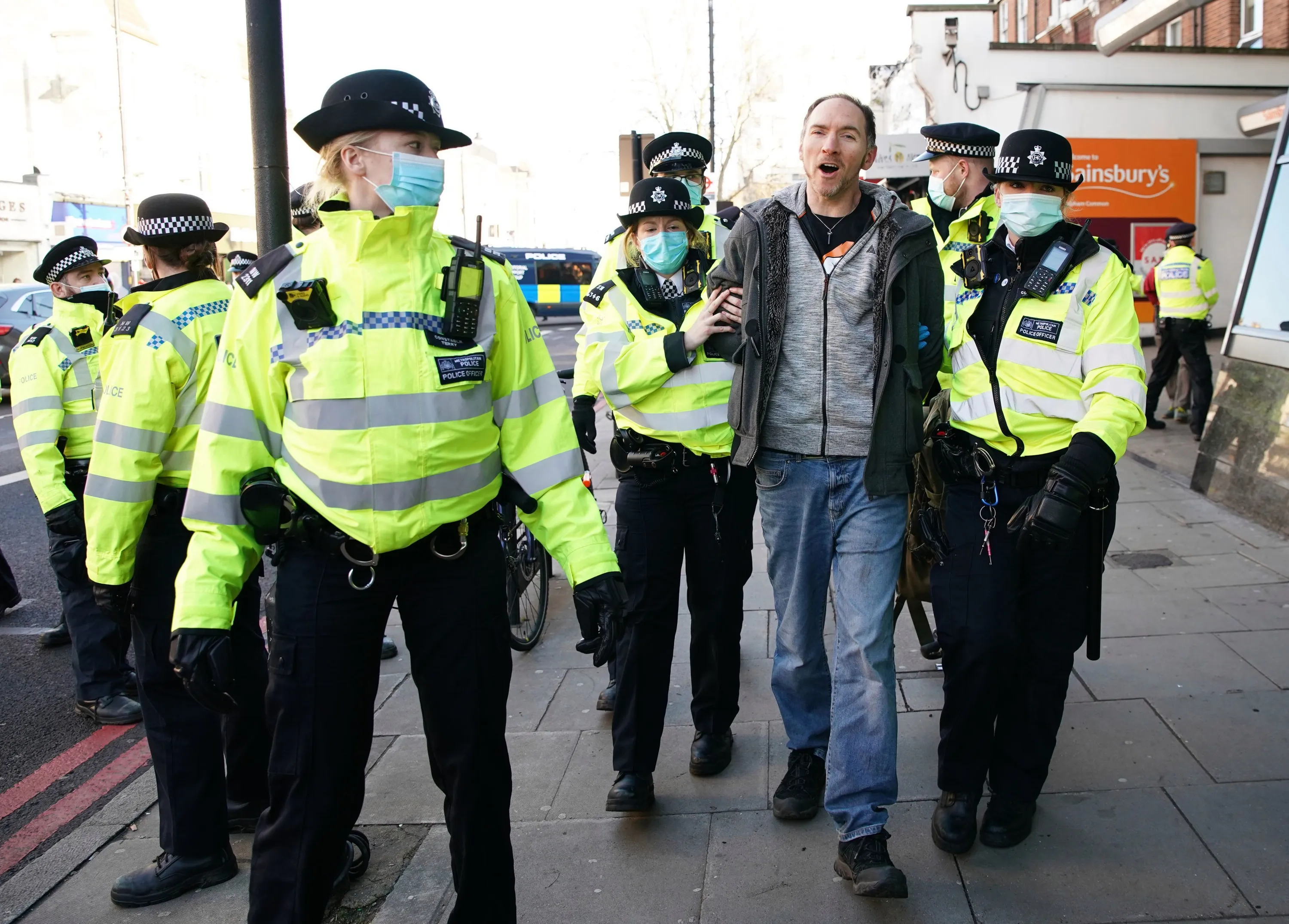 Police detain a man during an anti-lockdown protest in Clapham Common, London, United Kingdom on January 9, 2021. Rabbles gathered in London despite the plea of experts and authorities to stay at home to stop the spread of the deadly bug as cases continue to soar. (Photo by Aaron Chown/PA Images via Getty Images)