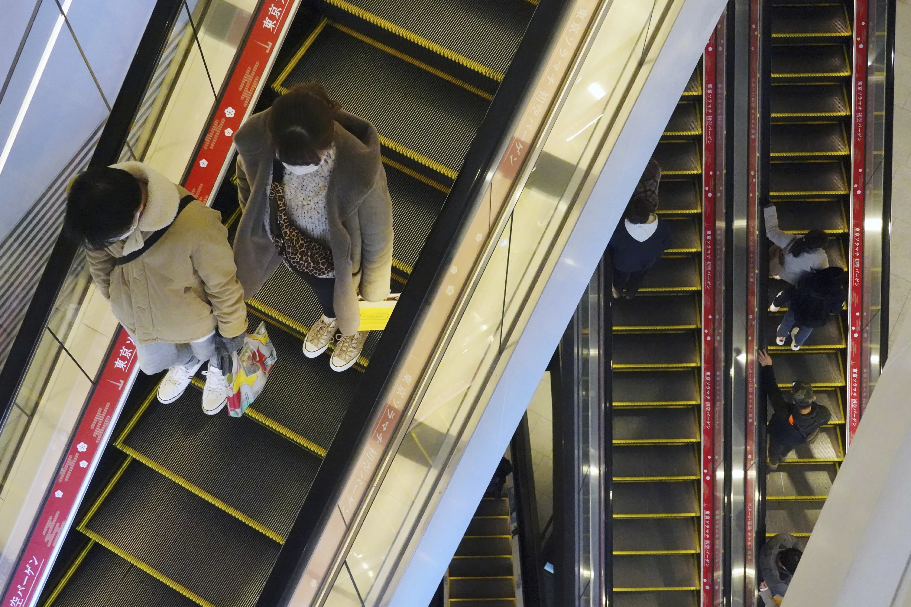 People wearing protective masks to help curb the spread of the coronavirus take usually crowded escalators at a shopping arcade in Tokyo Saturday, January 9, 2021. The Japanese capital confirmed more than 2200 new coronavirus cases on Saturday. Japanese Prime Minister Yoshihide Suga declared a state of emergency last Thursday for Tokyo and three other prefectures to ramp up defenses against the spread of the coronavirus. (Photo by Eugene Hoshiko/AP Photo)