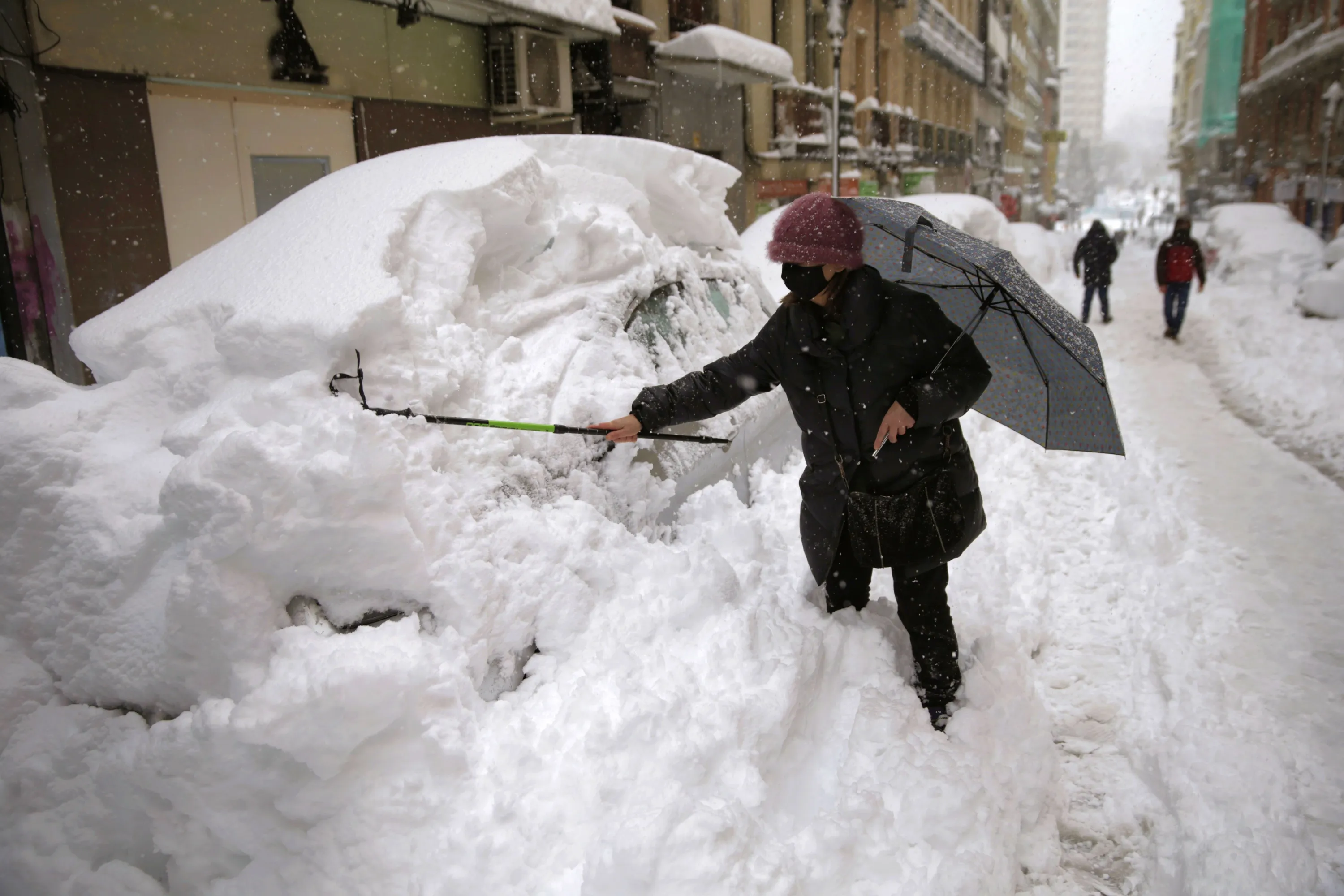 A woman tries to remove the snow from her car during a heavy snowfall in downtown Madrid, Spain, Saturday, January 9, 2021. (Photo by Andrea Comas/AP Photo)