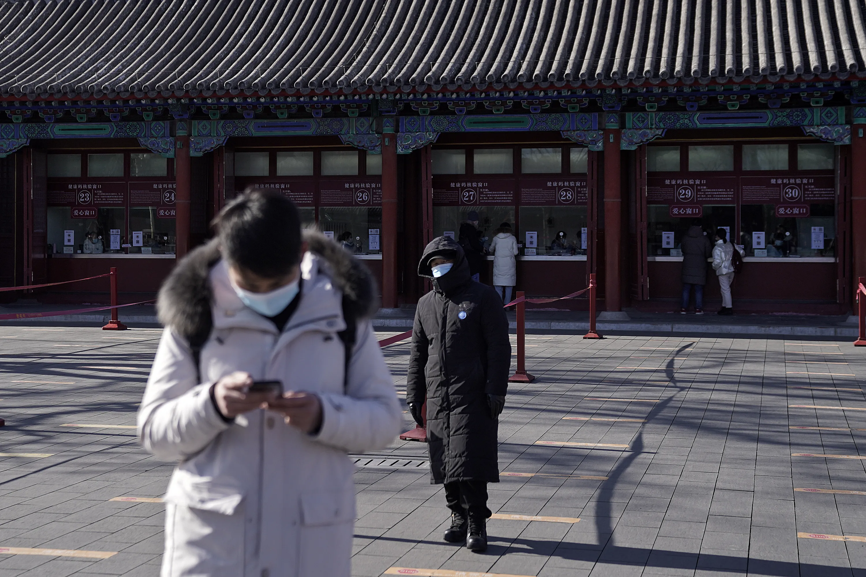 A man wearing a face mask to help curb the spread of the coronavirus browses his smartphone as a masked security guard stands near the quiet ticket counters at the Forbidden City in Beijing, Sunday, January 10, 2021. More than 360 people have tested positive in a growing COVID-19 outbreak south of Beijing in neighboring Hebei province. (Photo by Andy Wong/AP Photo)