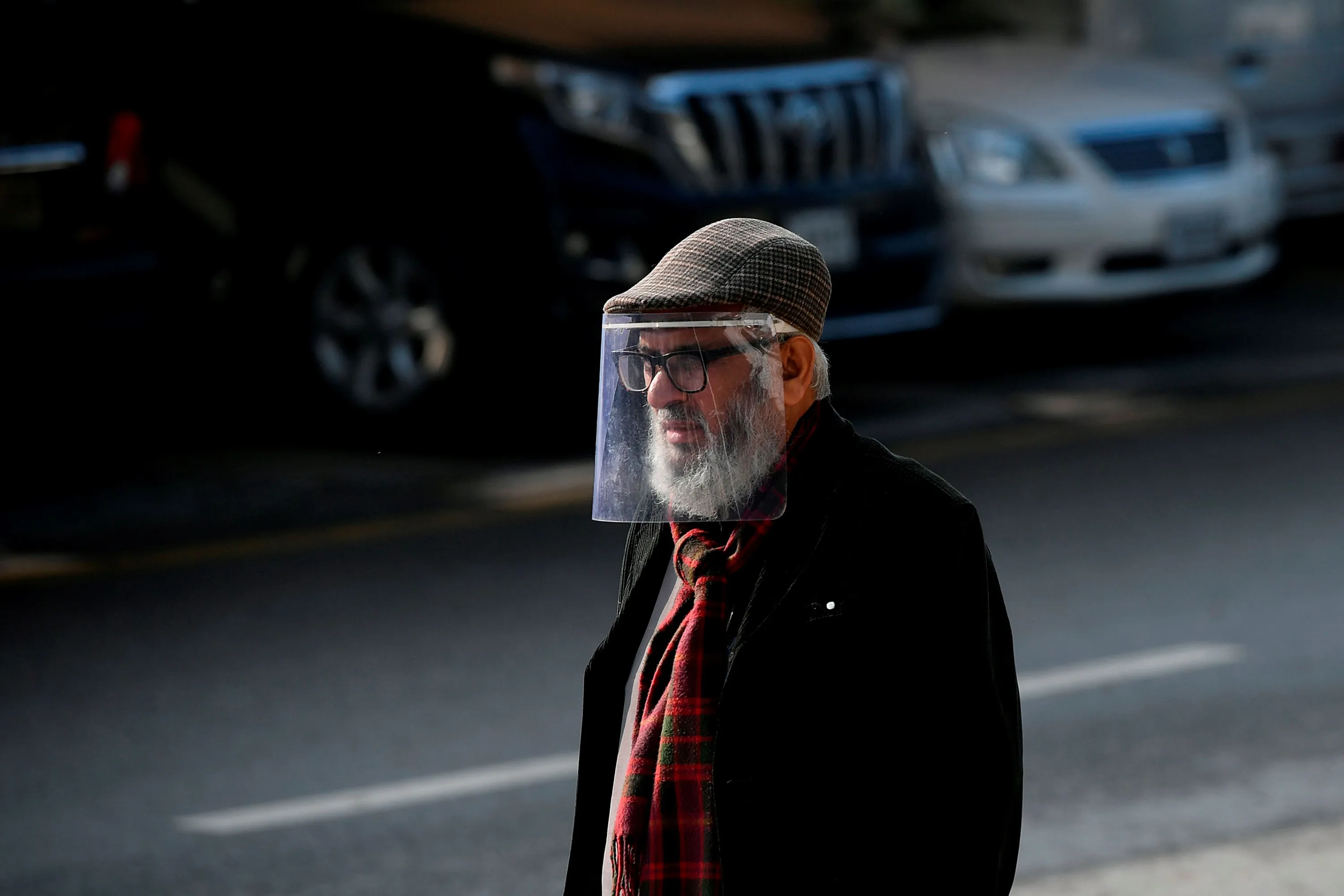 A man wearing a face shield as a preventive measure against the Covid-19 coronavirus walks along a street in Islamabad on December 9, 2020. (Photo by Aamir Qureshi/AFP Photo)