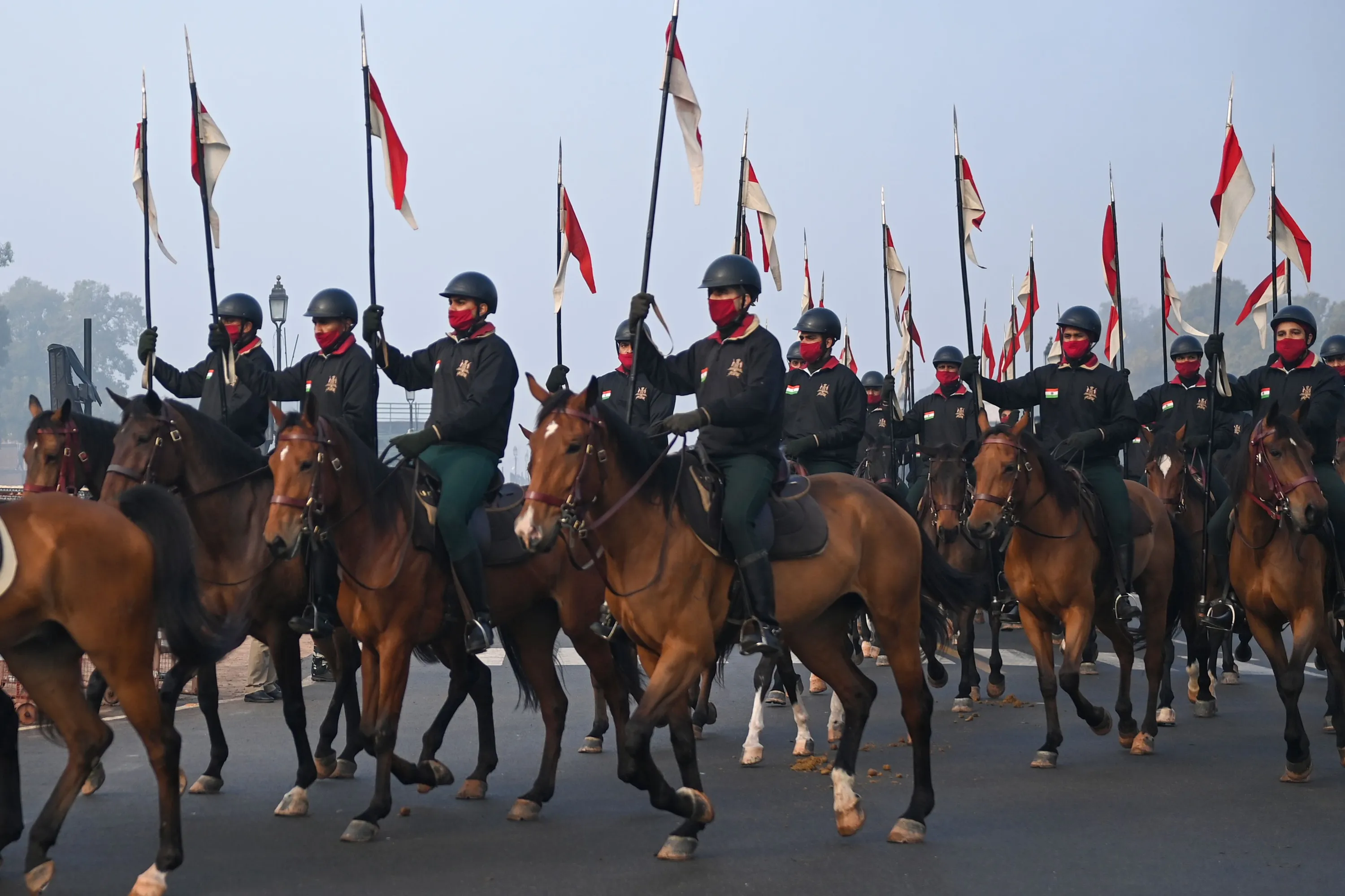 Indian presidential guards take part in a rehearsal for the upcoming Republic Day Parade near India Gate in New Delhi on January 4, 2021. (Photo by Money Sharma/AFP Photo)