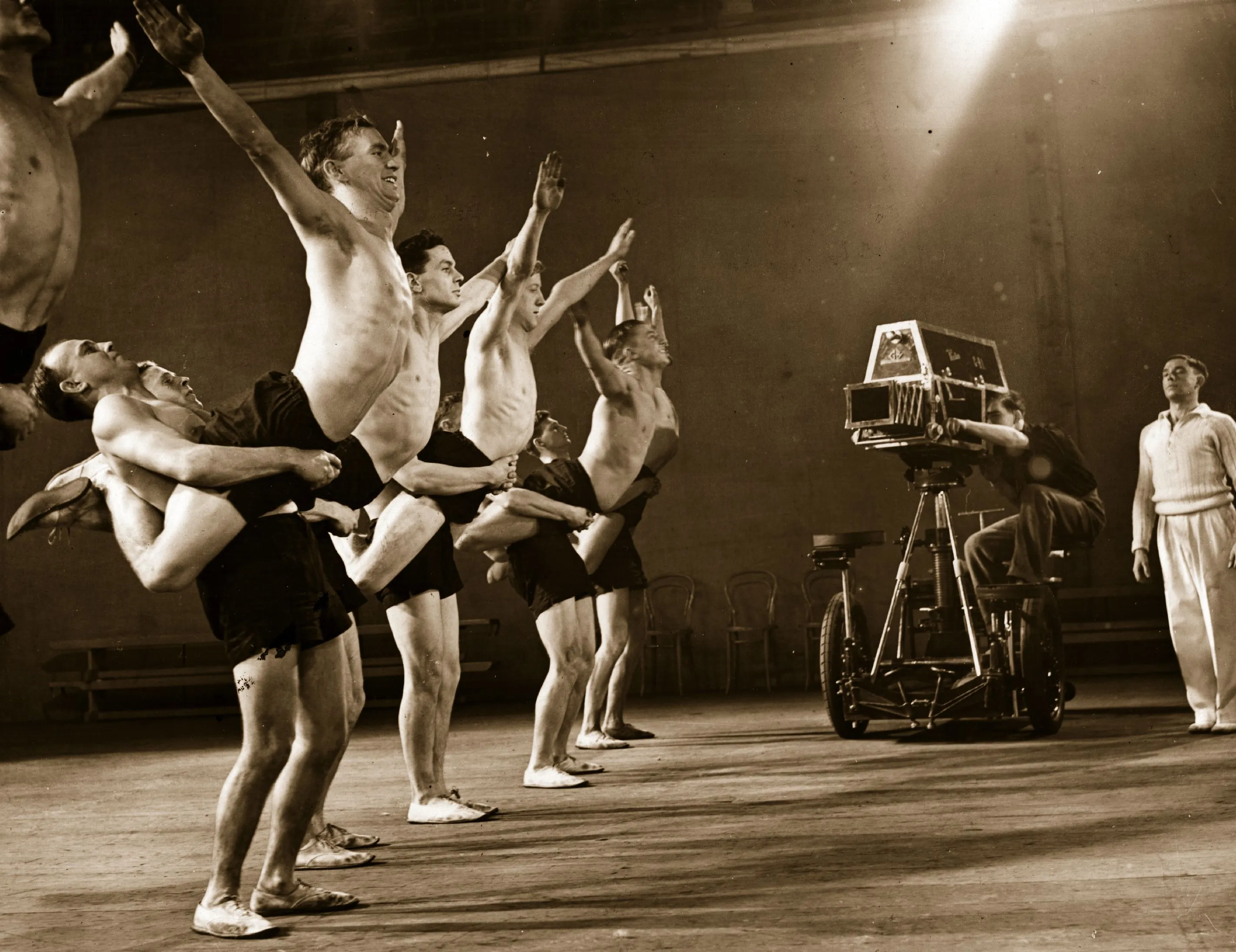 A group of young men, trained gymnasts from the Carnegie Institute, Leeds, taking part in a short instructional and propaganda film being made by the National Fitness Council at Shepherd's Bush studios, London, 22nd February 1939. (Photo by Fred Morley/Fox Photos/Getty Images)