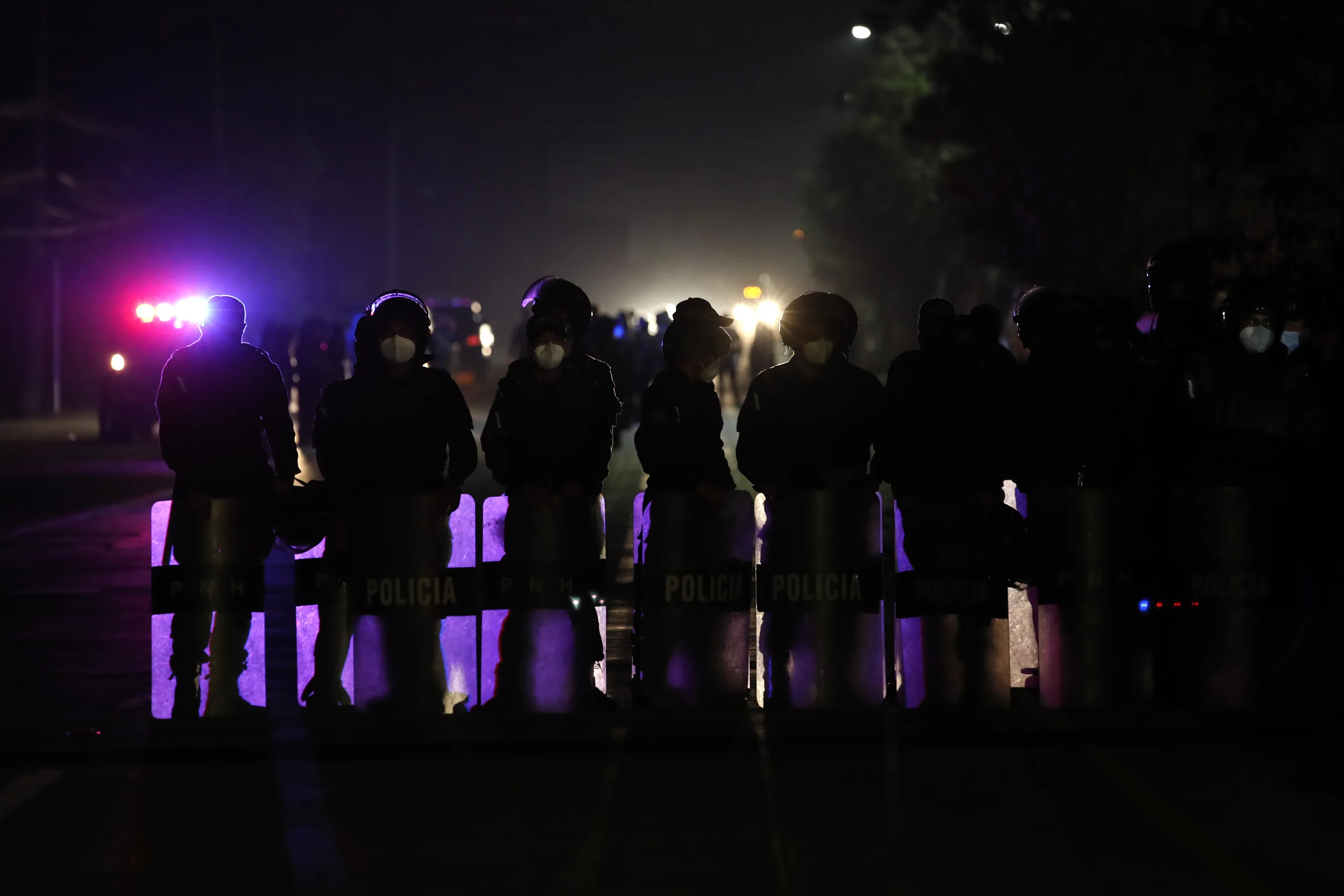 Police stand ready to block the way of a group of migrants walking along a highway hoping to reach the distant U.S. border, on the outskirts of San Pedro Sula, Honduras, shortly after setting off, Wednesday, January 13, 2021. About 200 migrants began walking toward the border with Guatemala, two days before a migrant caravan was scheduled to depart the city. (Photo by Moises Castillo/AP Photo)