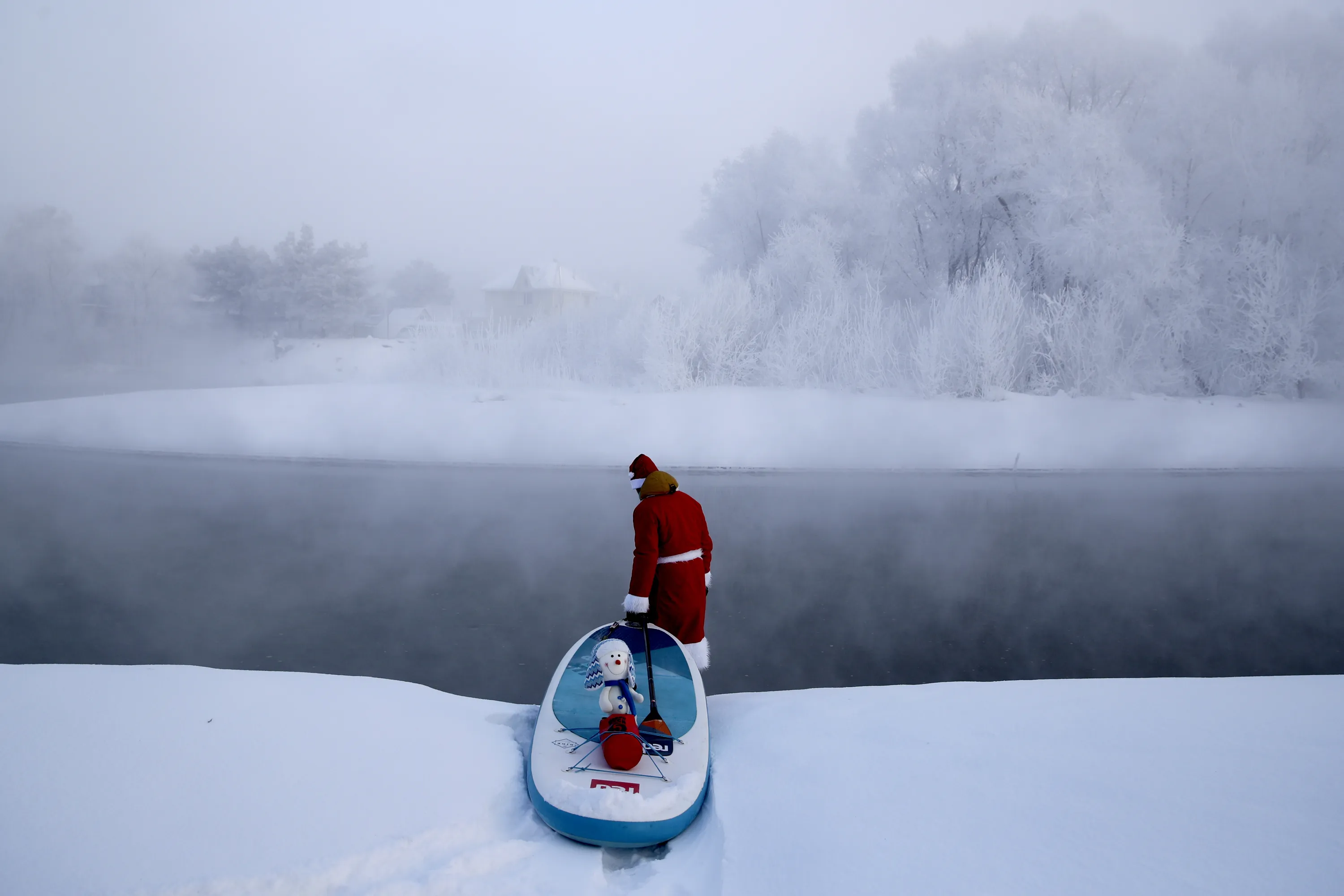 SUP_Novosibirsk stand up paddle boarding club founder Yevgeny Popov in a Santa Claus costume SUP surfs on a confluent of the Ob River in Novosibirsk, Russia on December 27, 2020. (Photo by Kirill Kukhmar/TASS)