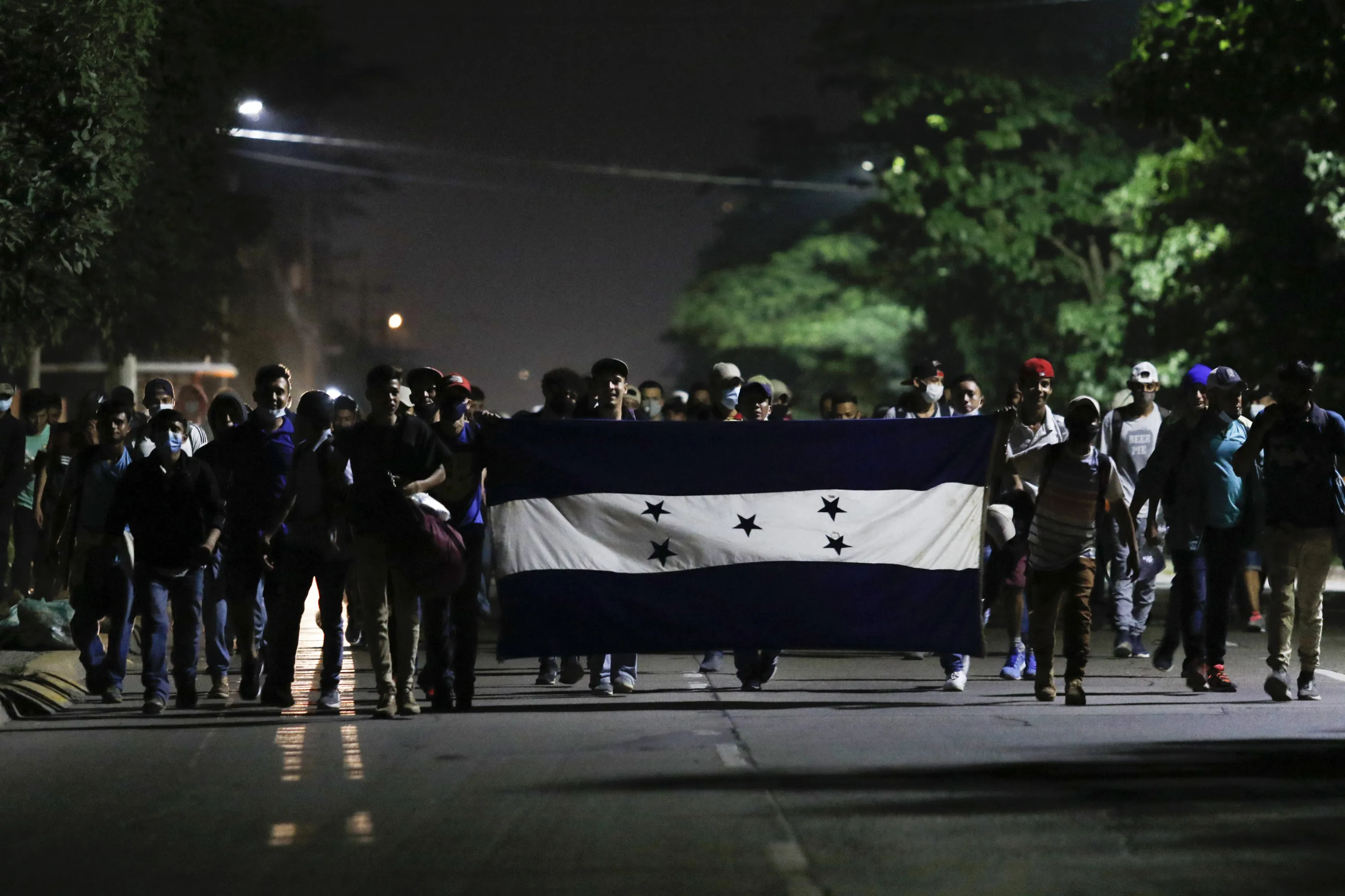 Honduran migrants trying to reach the U.S. border walk along a highway carrying their national flag as they leave San Pedro Sula, Honduras, before dawn Friday, January 15, 2021. The group quickly dispersed along the heavily-trafficked highway to the border town of Agua Caliente, but estimates of their number ranged from 2,000 to more than twice that. (Photo by Delmer Martinez/AP Photo)
