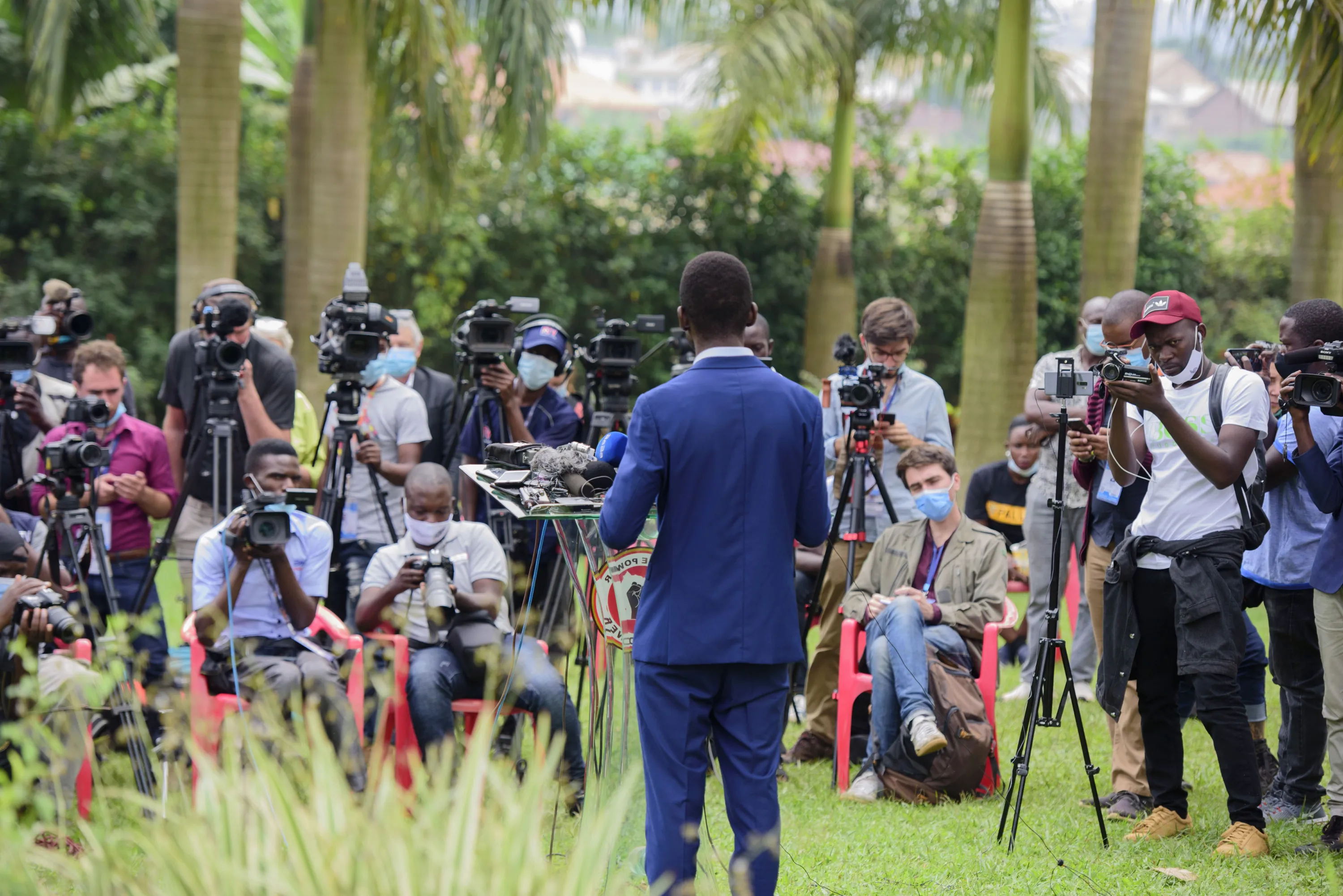 The National Unity platform presidential candidate Bobi Wine addresses the media at his home in Magere, Uganda, Friday, January 15, 2021. Uganda's electoral commission says President Yoweri Museveni leads in Thursday's election with results in from 29% of polling stations. He has 63% of ballots while top opposition candidate Bobi Wine has 28%. Wine, a popular singer-turned-lawmaker half the president's age, alleges that the vote in the East African country was rigged. (Photo by Nicholas Bamulanzeki/AP Photo)