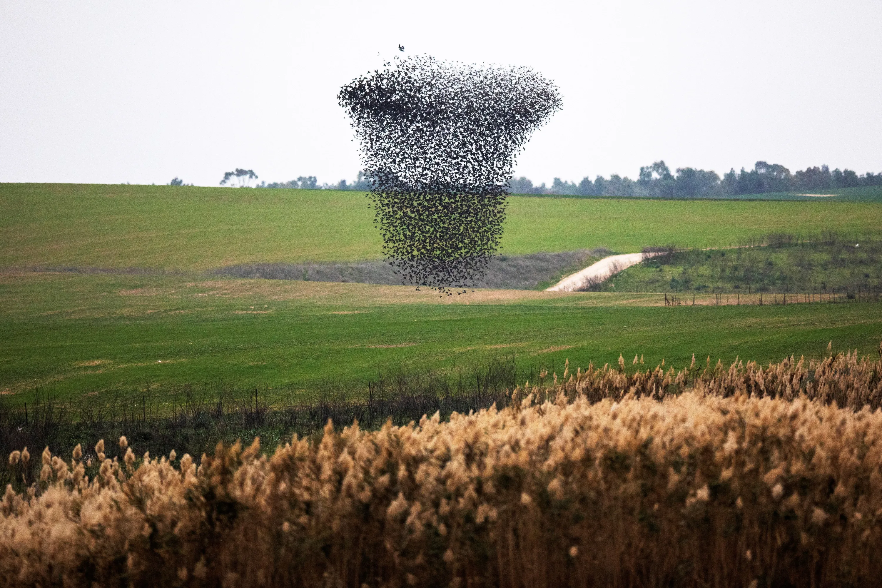 A murmuration of starlings fly above fields near Kiryat Gat, southern Israel on January 13, 2021. (Photo by Amir Cohen/Reuters)