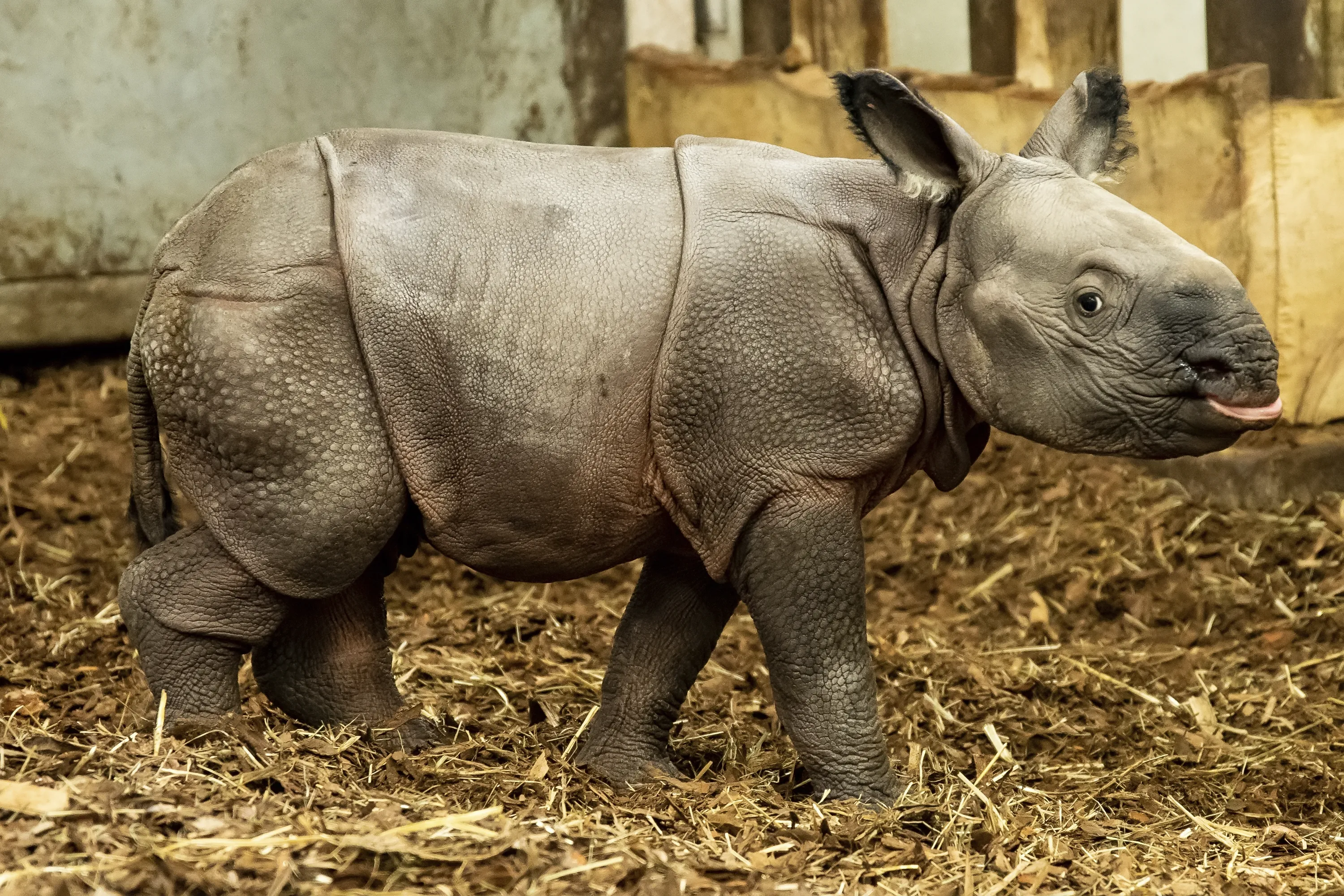 An endangered Indian rhinoceros cub stand in its enclosure in the Zoo in Wroclaw, Poland, Sunday, January 10, 2021. (Photo by Zoo Wroclaw via AP Photo)