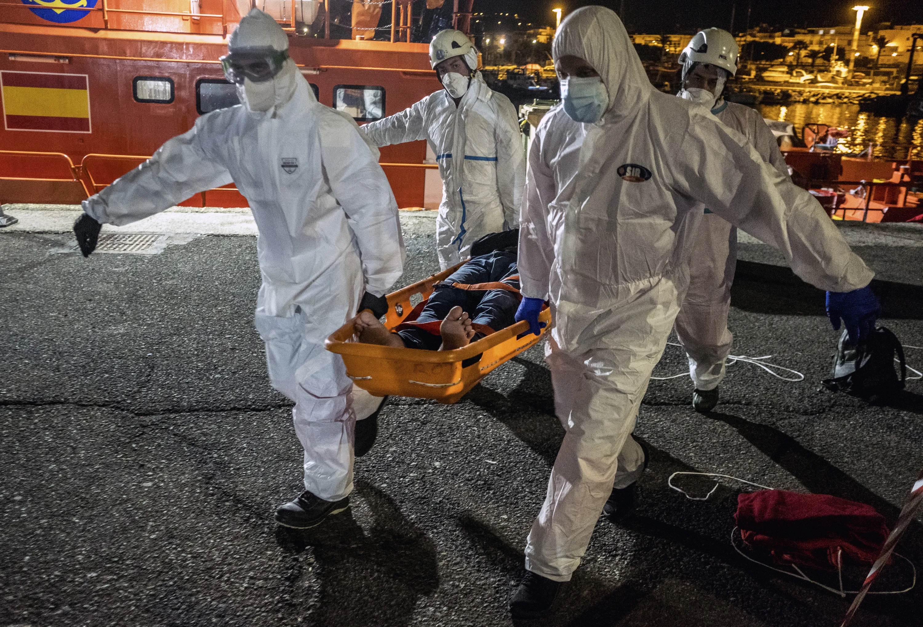 A migrant is carried off a rescue ship in the port of Arguineguin, Gran Canaria island, Spain, Saturday January 16, 2021. The Spanish rescue ship rescued a boat 160 kilometres south of Gran Canaria with 11 men, 20 women and 3 children on board in very poor condition. (Photo by Javier Bauluz/AP Photo)