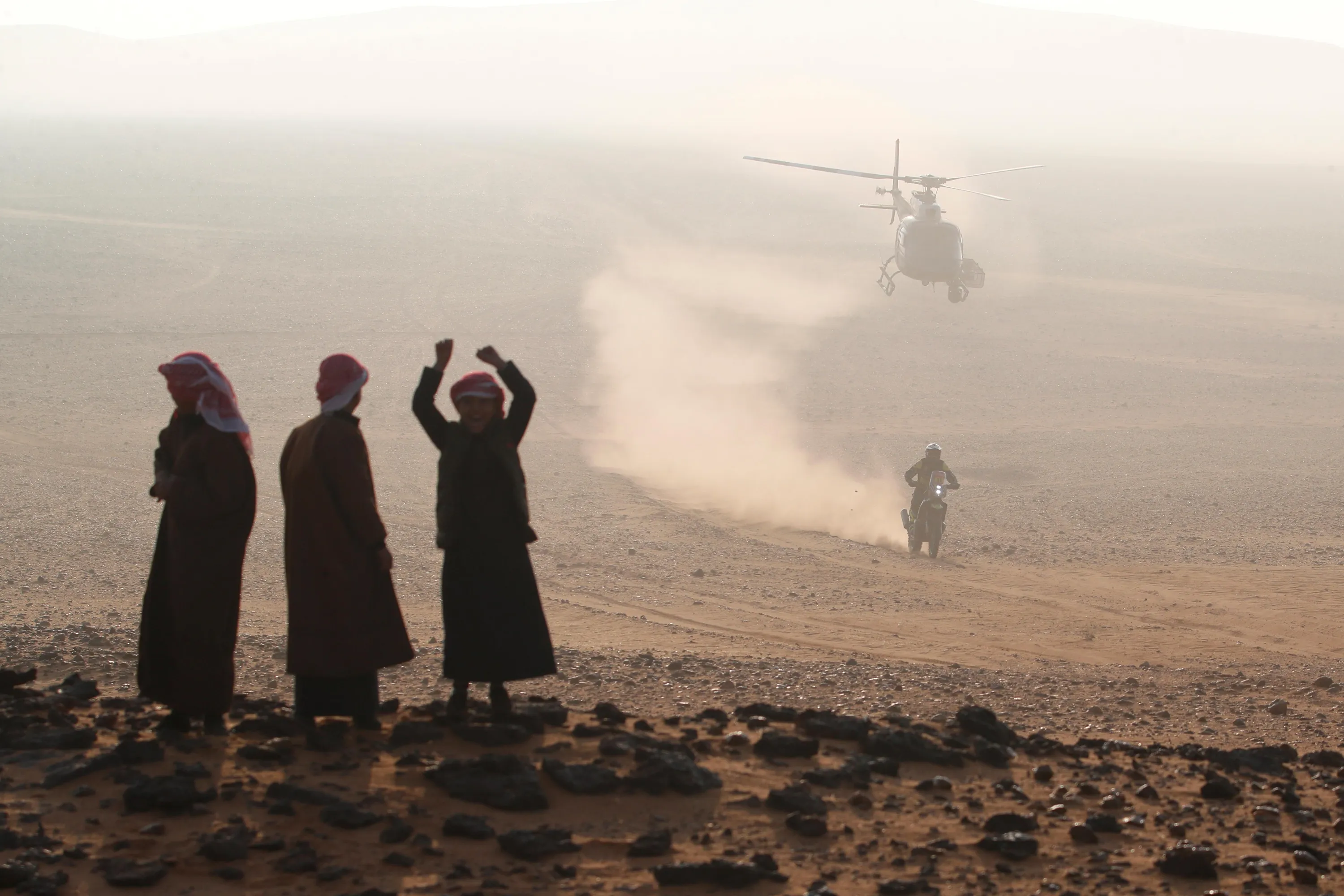 A child cheers as Slovnaft Rally Team's Stefan Svitko approaches during stage 8, Sakaka to Neom, Saudi Arabia on January 11, 2021. (Photo by Hamad I Mohammed/Reuters)