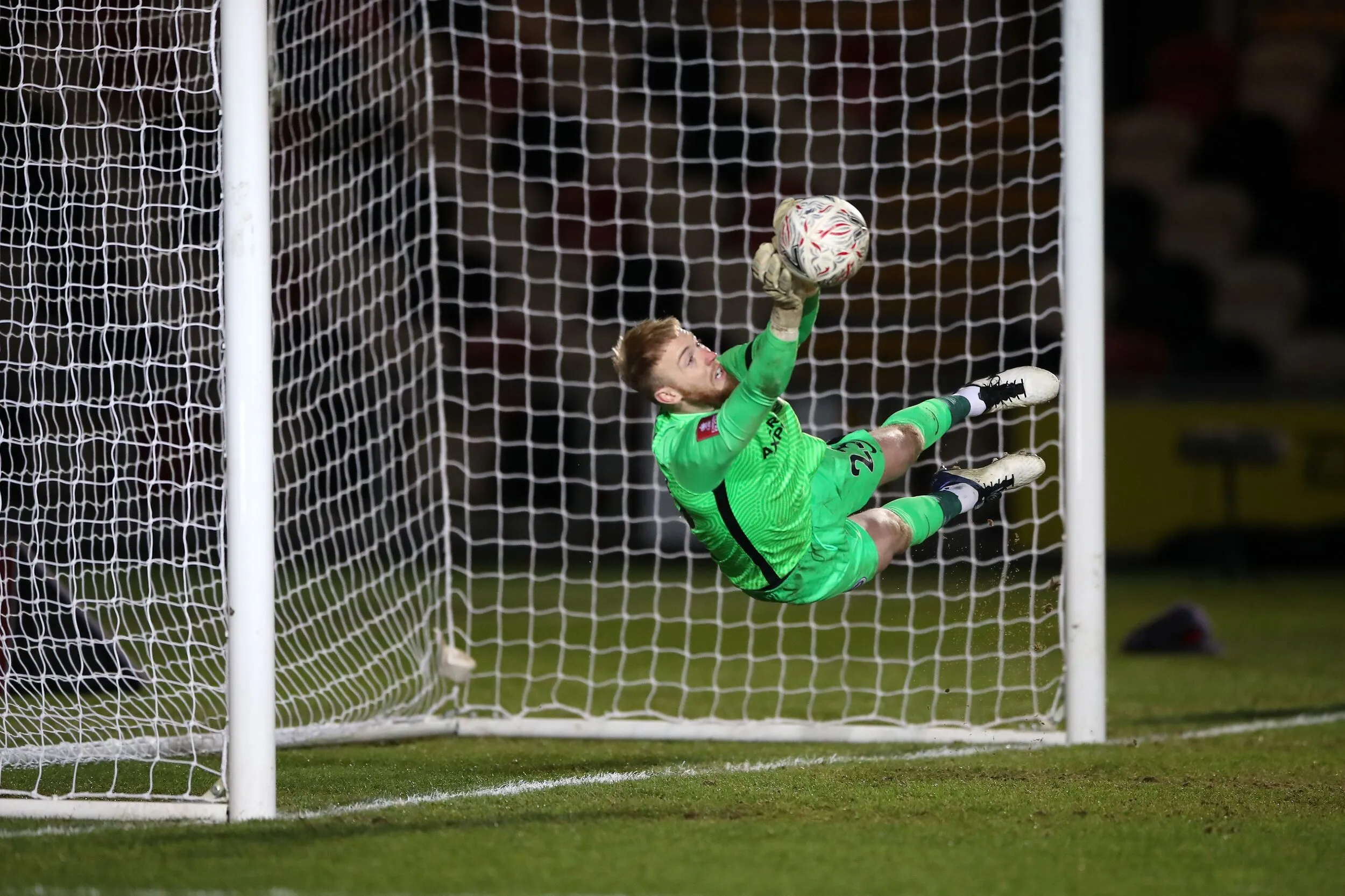 Brighton's English goalkeeper Jason Steele saves a penalty from Newport County's Welsh defender Liam Shephard (not seen) during the penalty shoot-out in the English FA Cup third round football match between Newport County and Brighton and Hove Albion at Rodney Parade in Newport, south Wales on January 10, 2021. (Photo by Nick Potts/Pool via AFP Photo)