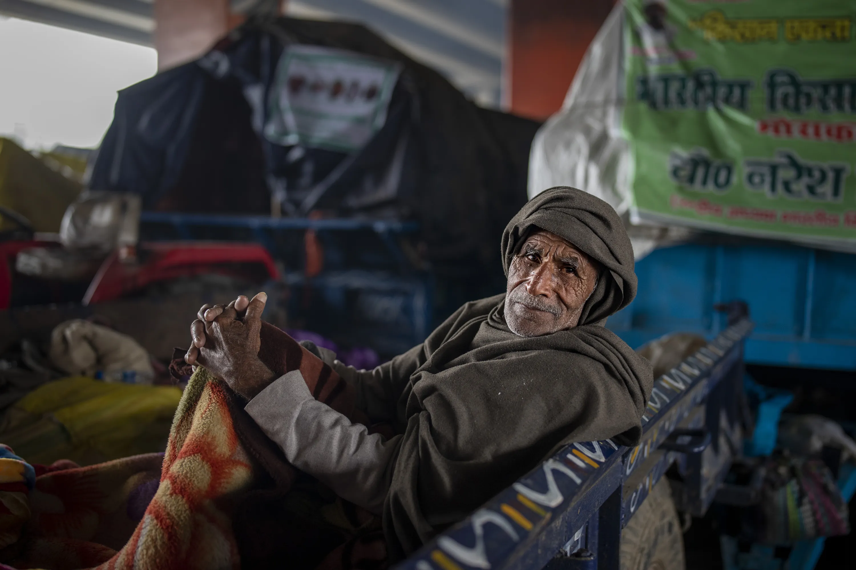An elderly farmer sits in the back of a tractor trolly as they block a highway in protest against new farm laws at the Delhi-Uttar Pradesh state border, on the outskirts of New Delhi, India, Monday, January 11, 2021. (Photo by Altaf Qadri/AP Photo)