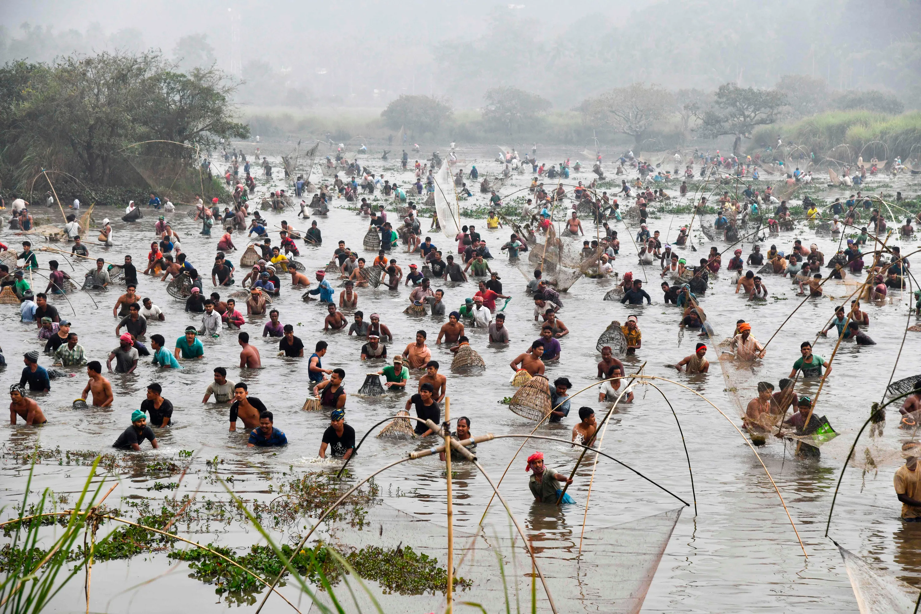 Villagers participate in a community fishing event during Bhogali Bihu harvest celebrations at Goroimari Lake in Panbari on January 13, 2021. (Photo by Biju Boro/AFP Photo)