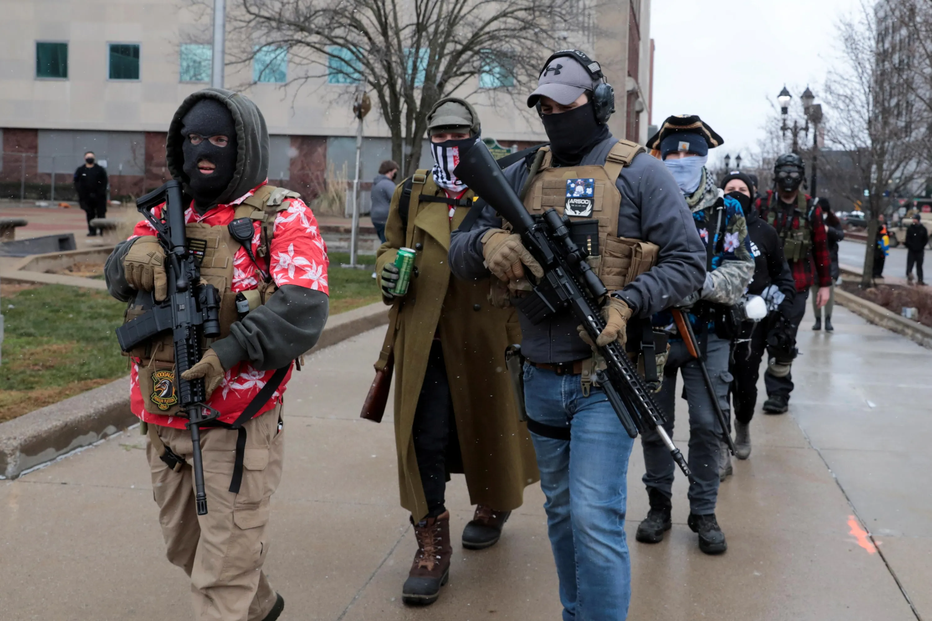 Members of the Boogaloo Bois protest against the election of President-elect Joe Biden, outside the Michigan State Capitol in Lansing, Michigan, U.S. January 17, 2021. (Photo by Rebecca Cook/Reuters)