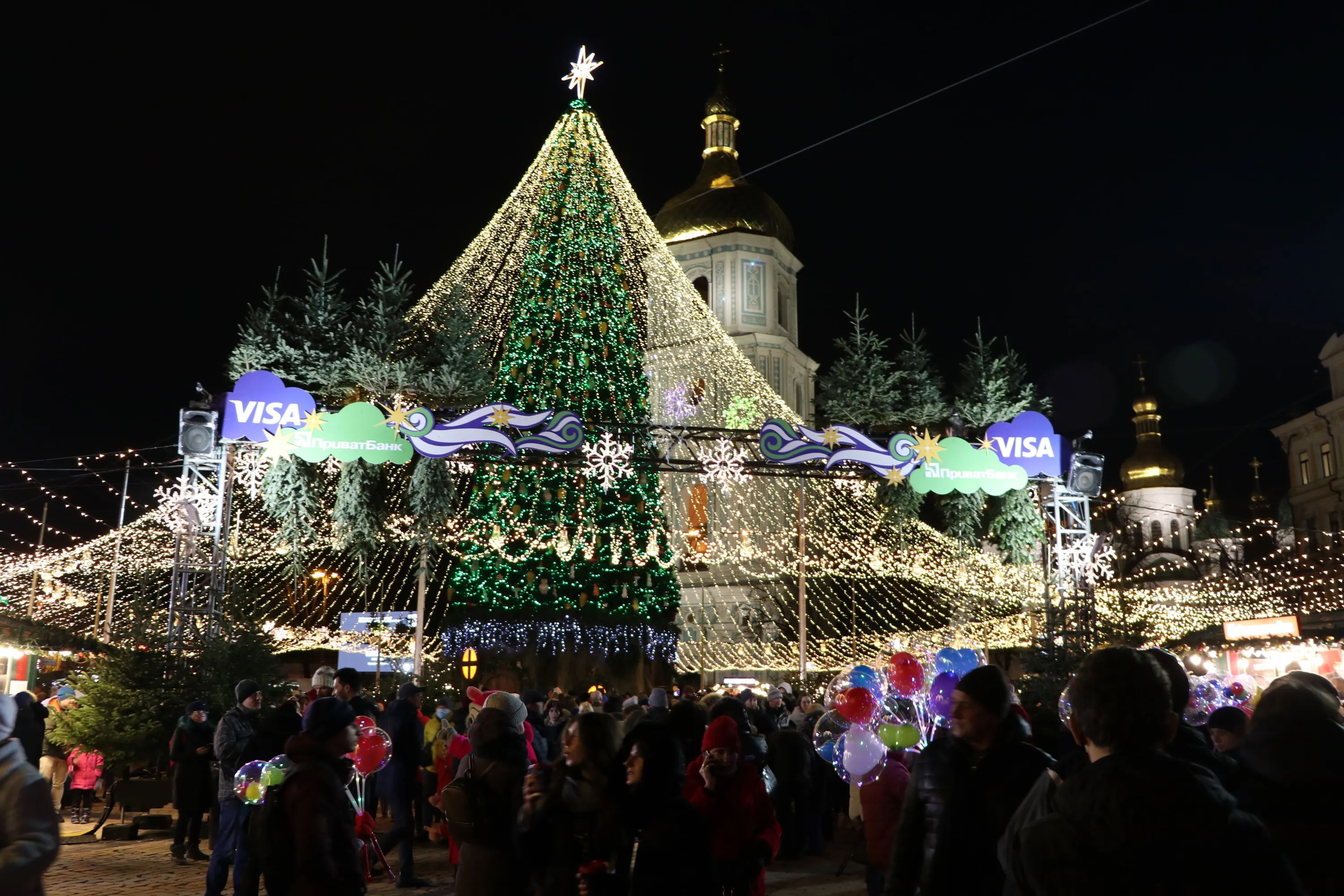 People are seen around giant Christmas Tree illuminated as part of Christmas celebration amid the coronavirus (Covid-19) pandemic at Sofievska Square in Kiev, Ukraine on December 26, 2020. (Photo by Talha Yavuz/Anadolu Agency via Getty Images)
