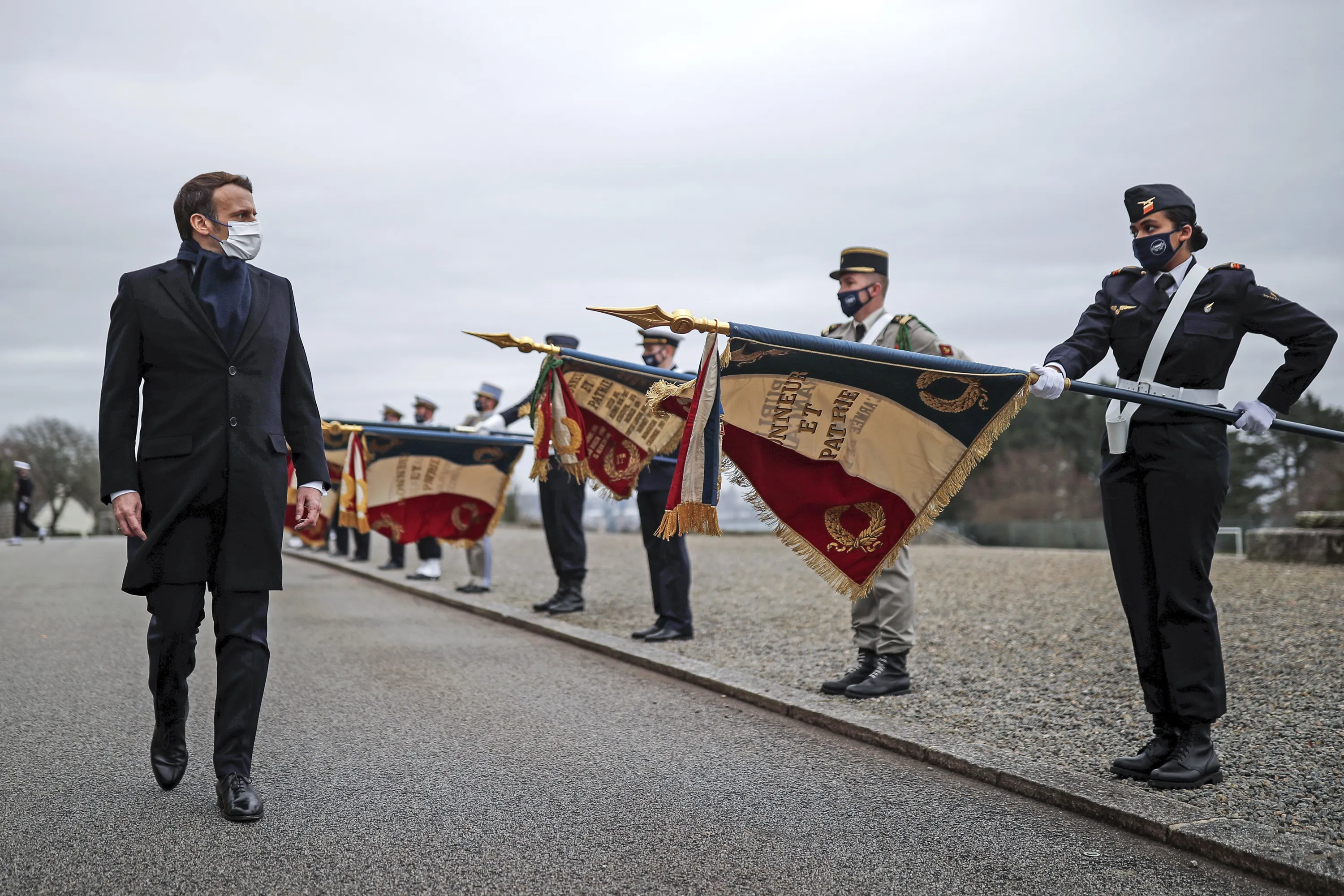 French President Emmanuel Macron review the troops prior to his New Year's speech to the French Armed Forces at Brest naval training center, western France, Tuesday, January 19, 2021. (Photo by Stephane Mahe/Pool Photo via AP Photo)