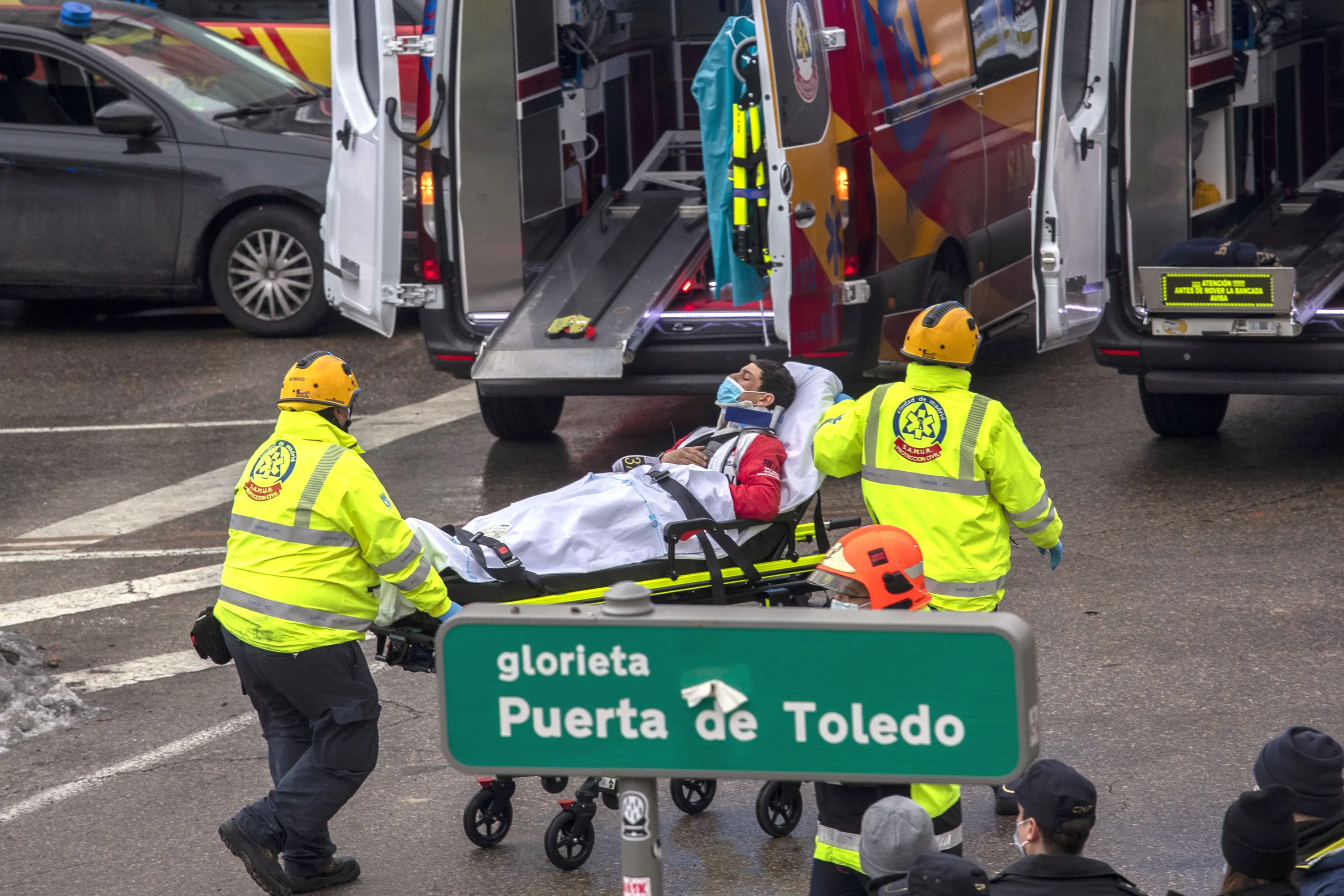 An injured is transferred from the scene of an explosion in downtown Madrid, Spain, Wednesday, January 20, 2021. (Photo by Bernat Armangue/AP Photo)