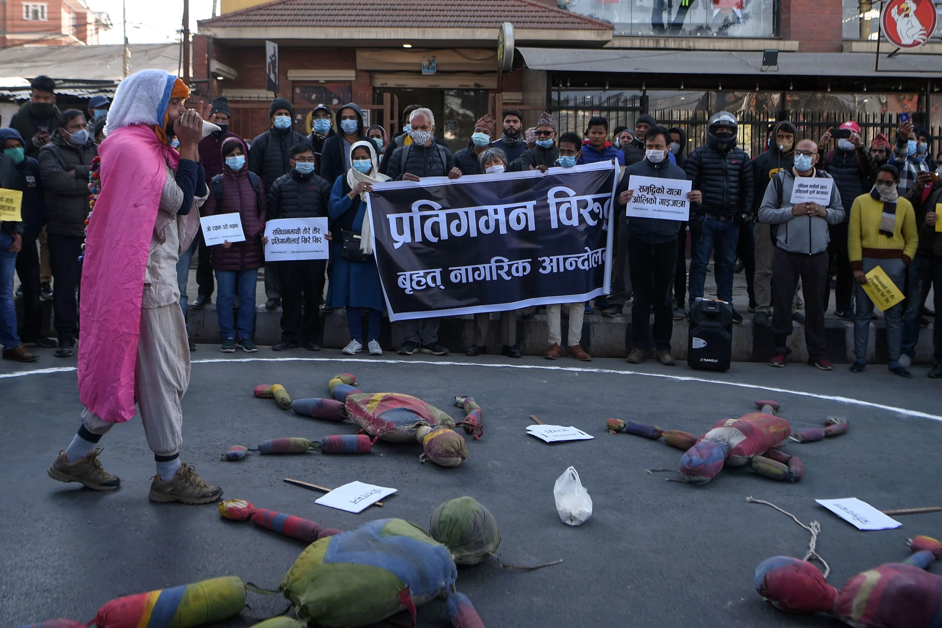 Civil society activists participate in a demonstration against the dissolution of the country's parliament, in Kathmandu on December 26, 2020. (Photo by Prakash Mathema/AFP Photo)