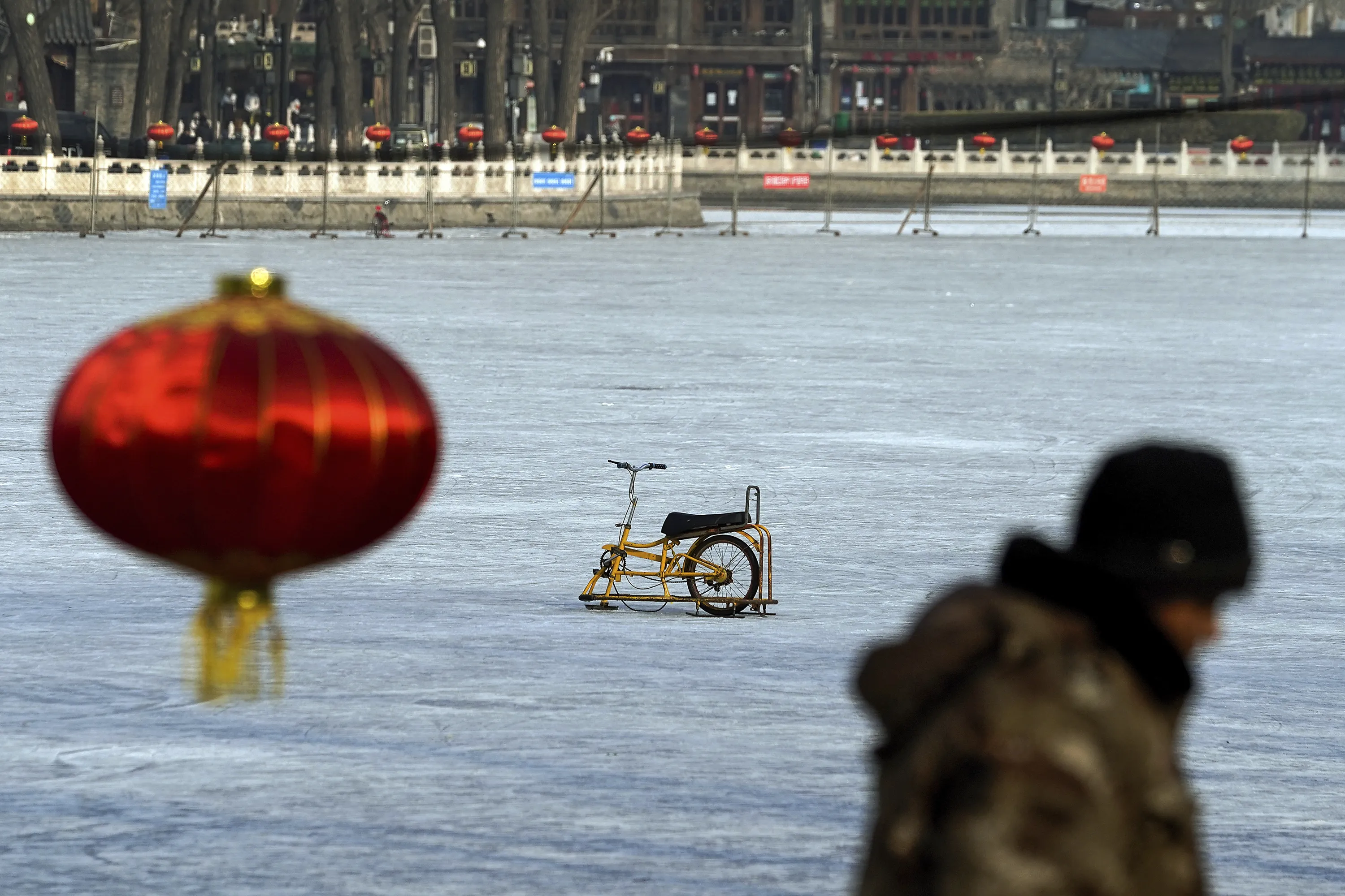 A worker walks by a specially made steel sled parked alone on the capital popular ice skating frozen Houhai Lake after it was ordered to close following the coronavirus cases surge, in Beijing, Thursday, January 21, 2021. China is making some of its toughest travel restrictions yet as coronavirus cases surge in several northern provinces ahead of the travel rush for Lunar New Year next month. (Photo by Andy Wong/AP Photo)