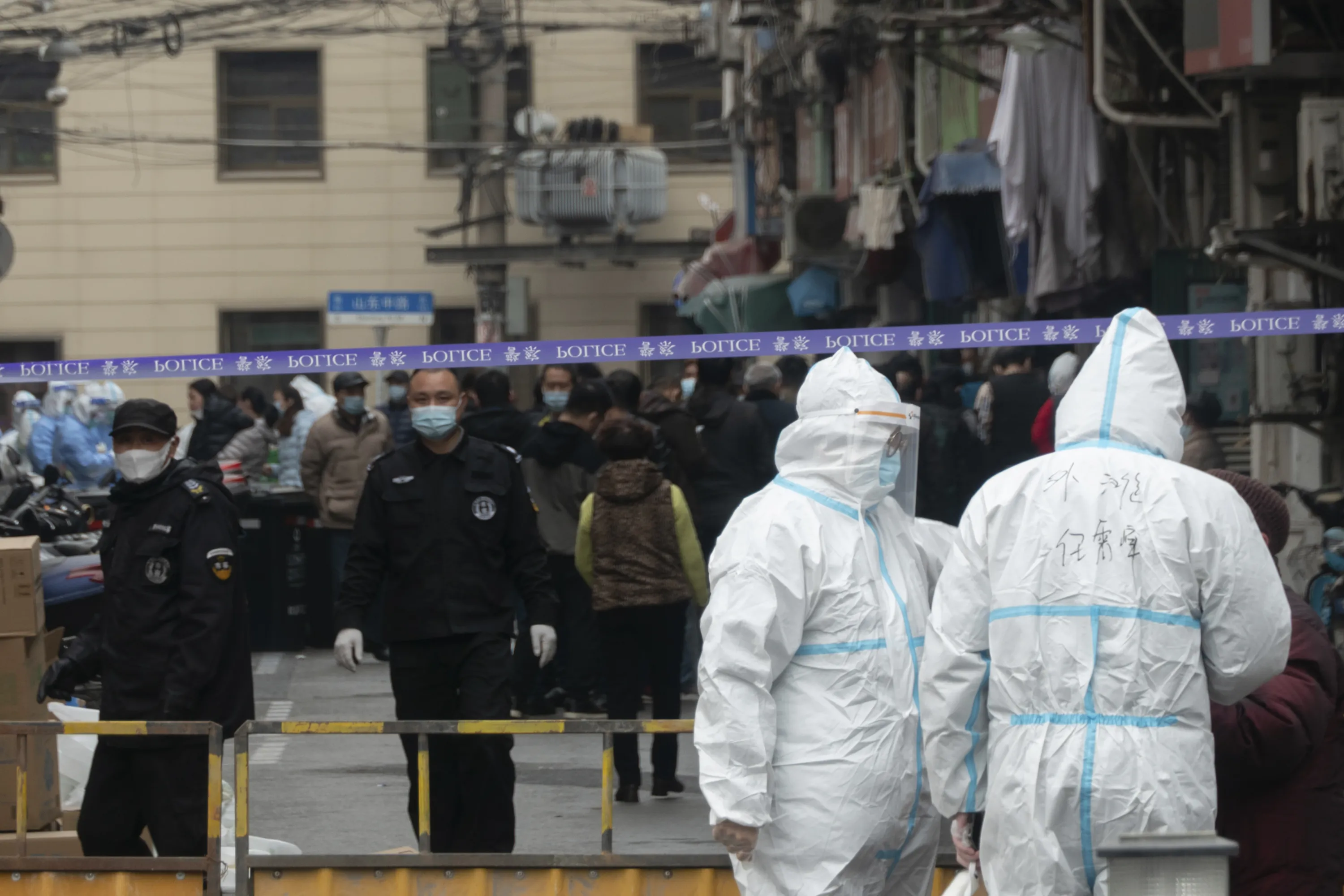 Police officers and workers in protective suits close off a neighborhood as it is placed under lockdown in Shanghai, China, Thursday, January 21, 2021. Shanghai has imposed lockdowns on two of China's best-known hospitals and some surrounding residential communities after they were linked to new coronavirus cases. (Photo by Chinatopix via AP Photo)