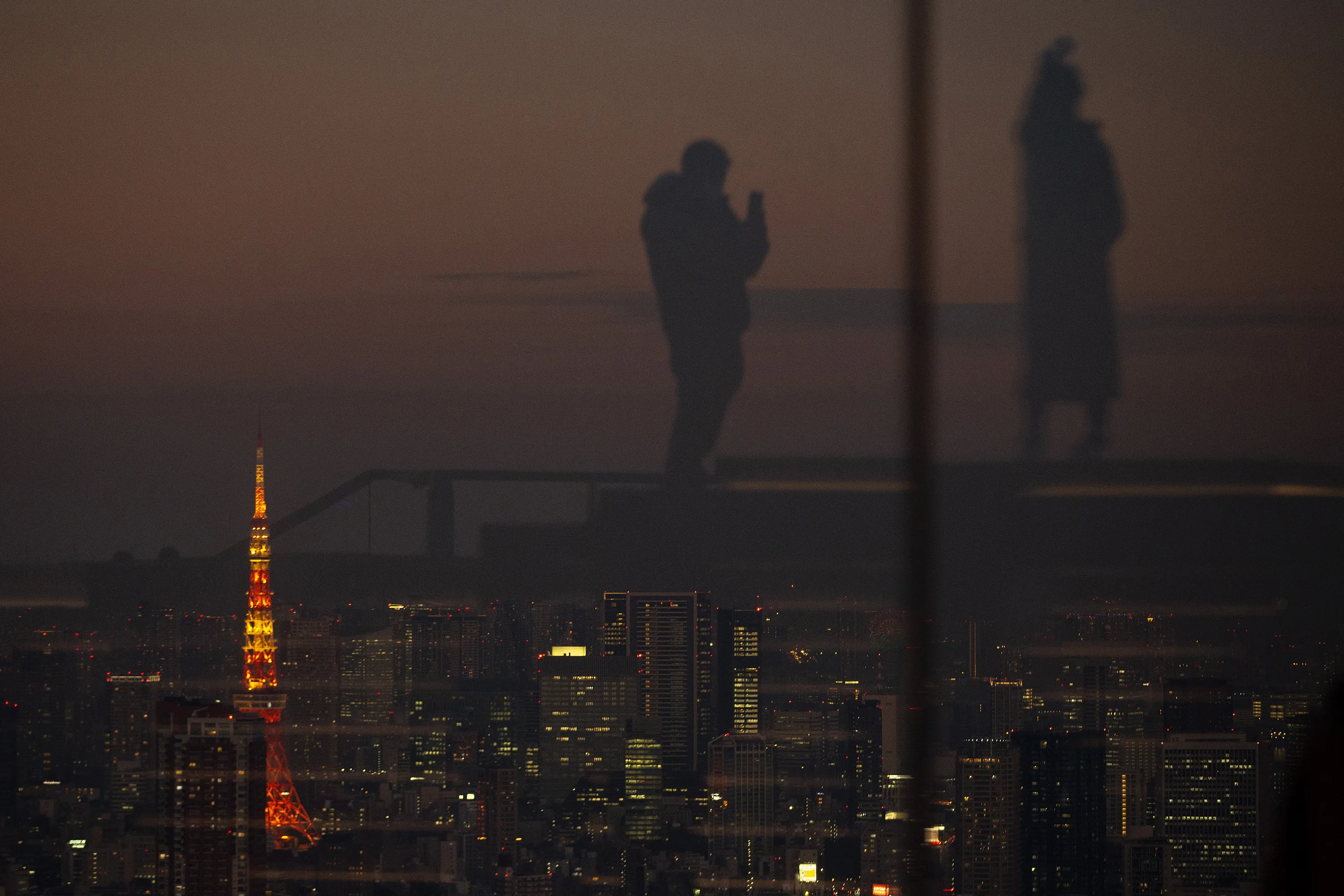 Silhouetted against the warm sunset skyline and the illuminated Tokyo Tower, visitors are reflected on the glass walls of a rooftop observation deck Thursday, January 21, 2021, in Tokyo. (Photo by Kiichiro Sato/AP Photo)