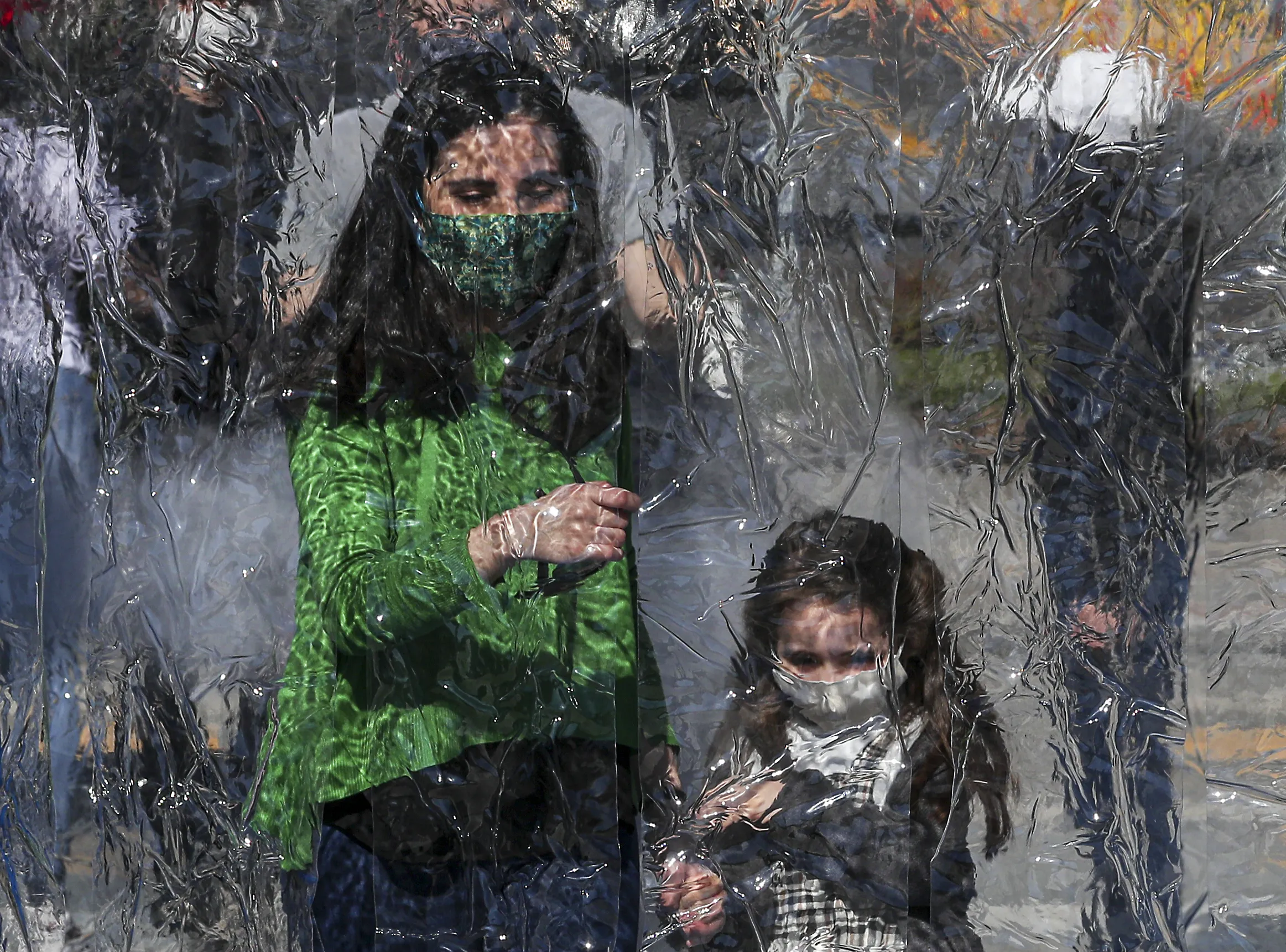 A woman and child wearing protective face masks prepare to enter a decontamination chamber as a precaution against the spread of the new coronavirus, at the entrance of Araucano Park in Las Condes borough of Santiago Chile, Wednesday, July 29, 2020. As the Chilean government put a roadmap in place to roll back quarantine measures, various neighborhoods in the capital started on Tuesday to ease the COVID-19 lockdown. (Photo by Esteban Felix/AP Photo)