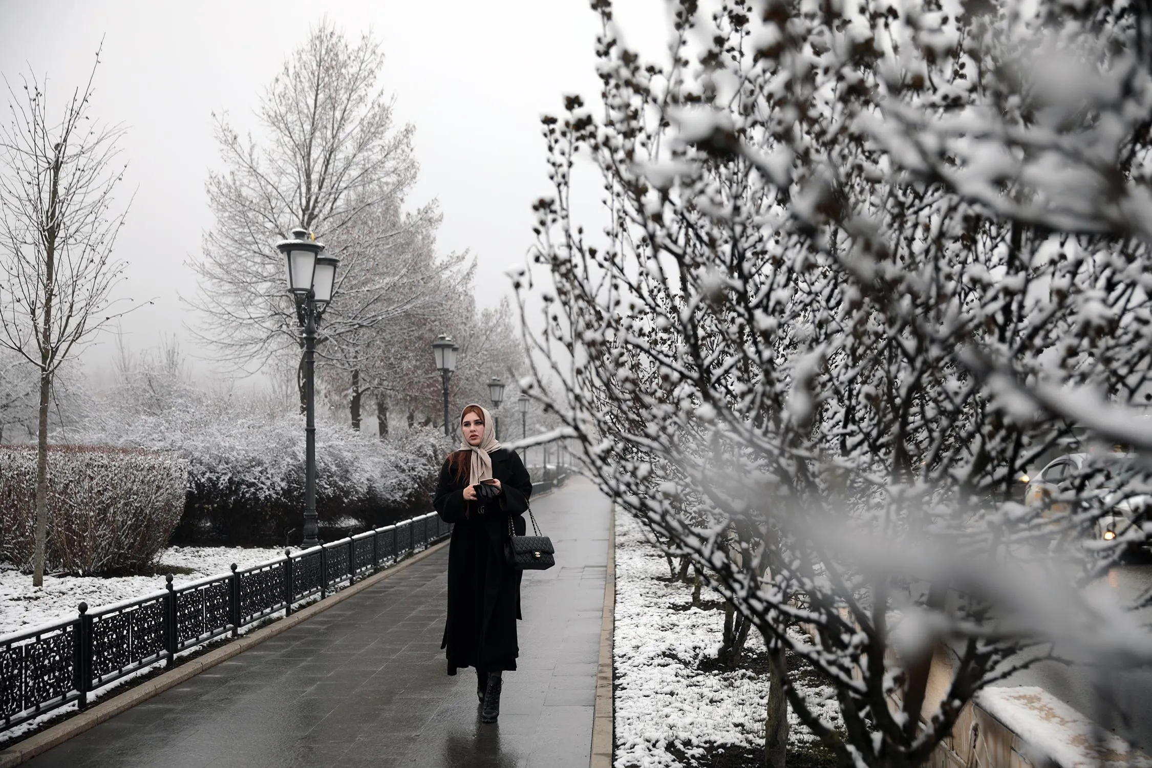 A girl walks in a street after a snowfall in Grozny, Russia on January 12, 2021. This week temperatures are expected to fall as low as –9C. (Photo by Yelena Afonina/TASS)