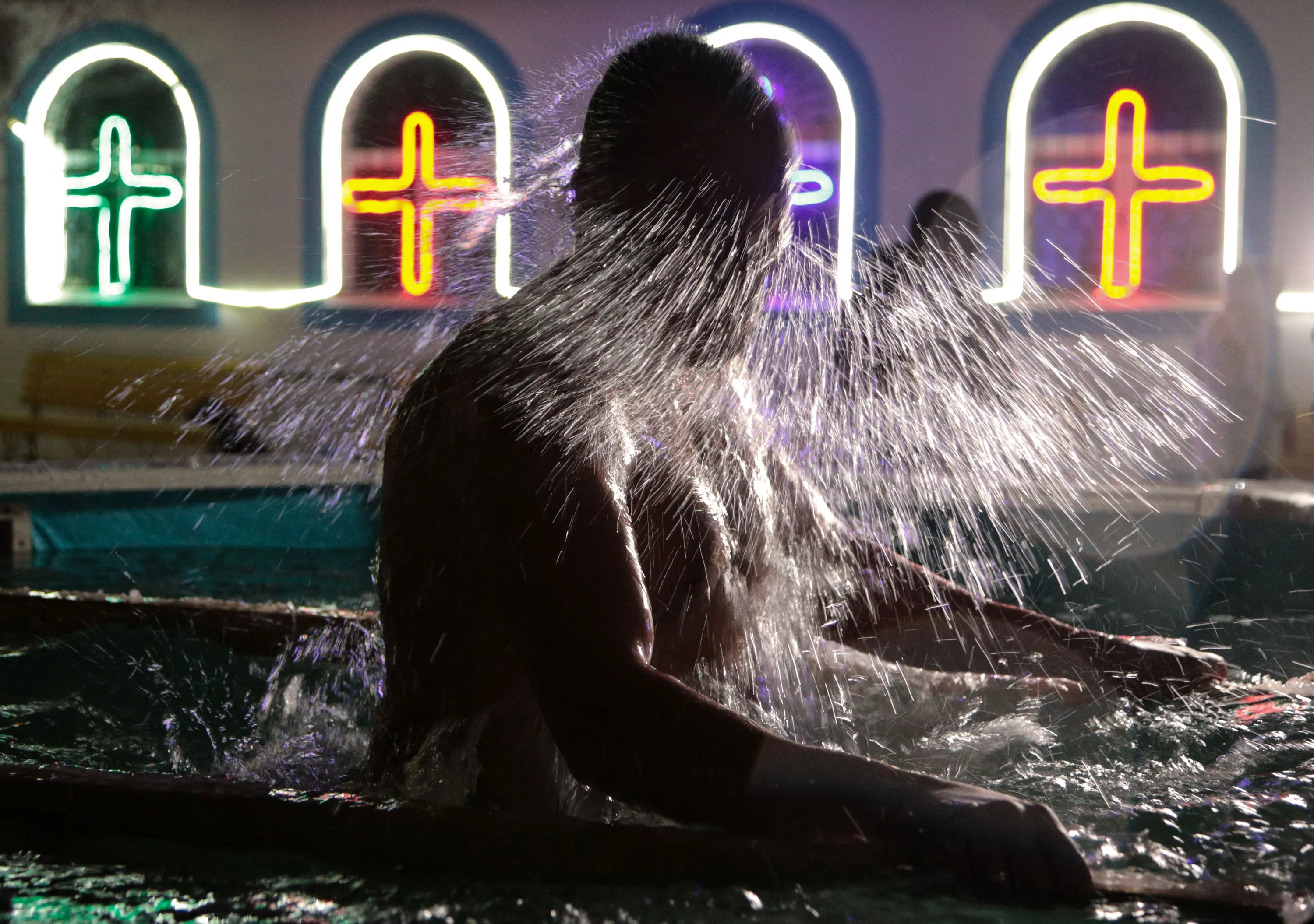 A Christian Orthodox believer plunges into the waters of a portable pool set outside a church during the celebration of the Epiphany holiday in Simferopol, Crimea, late on January 18, 2021. (Photo by AFP Photo/Stringer)